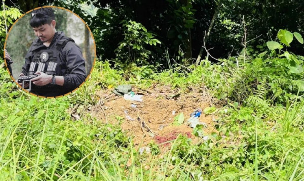 มีหลุมระเบิดลึก 2 ฟุต กว้าง 5 ฟุต และซากเศษชิ้นส่วนของระเบิดแสวงเครื่องที่คนร้ายประกอบใส่ไว้ในกล่องเล็ก หนัก 5 กก. จุดชนวนด้วยสลักนิรภัยแบบเท้าเหยียบ ตกกระจายเกลื่อนเป็นบริเวณกว้าง พร้อมกองเลือดจำนวนหนึ่ง