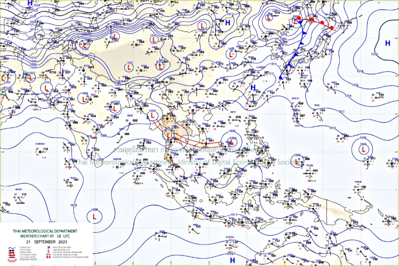 #กรมอุตุนิยมวิทยา#ประจำวันที่ 22 กันยายน 2564ลักษณะอากาศทั่วไป พยากรณ์อากาศ 24 ชั่วโมงข้างหน้า บริเวณประเทศไทยมีฝนตกต่อเนื่อง โดยมีฝนตกหนักมากบางพื้นที่ในภาคเหนือ ภาคกลาง ภาคตะวันออก และภาคใต้ฝั่งตะวันตก ส่วนภาคตะวันออกเฉียงเหนือ และภาคใต้ฝั่งตะวันออก รวมทั้งกรุงเทพมหานครและปริมณฑล มีฝนตกหนักบางแห่ง ขอให้ประชาชนในพื้นที่เสี่ยงภัยบริเวณดังกล่าวระวังอันตรายจากฝนตกหนักและฝนที่ตกสะสม ซึ่งอาจทำให้เกิดน้ำท่วมฉับพลันและน้ำป่าไหลหลากในระยะนี้ไว้ด้วยทั้งนี้เนื่องจากหย่อมความกดอากาศต่ำปกคลุมบริเวณภาคกลาง ประกอบกับร่องมรสุมพาดผ่านภาคกลาง ภาคตะวันออก และภาคตะวันออกเฉียงเหนือตอนล่าง ในขณะที่มรสุมตะวันตกเฉียงใต้ยังคงพัดปกคลุมทะเลอันดามัน ภาคใต้ และอ่าวไทยสำหรับคลื่นลมบริเวณทะเลอันดามันและอ่าวไทยมีกำลังปานกลาง โดยทะเลอันดามันและอ่าวไทยตอนบนมีคลื่นสูงประมาณ 2 เมตร ส่วนบริเวณอ่าวไทยตอนล่างทะเลมีคลื่นสูง 1-2 เมตร และบริเวณที่มีฝนฟ้าคะนองคลื่นสูงมากกว่า 2 เมตร ขอให้ชาวเรือเดินเรือด้วยความระมัดระวัง และหลีกเลี่ยงการเดินเรือบริเวณที่มีฝนฟ้าคะนองไว้ด้วยฝุ่นละอองขนาดเล็ก ในช่วงของฤดูฝนการสะสมของฝุ่นละออง/หมอกควันมีน้อยพยากรณ์อากาศสำหรับประเทศไทยตั้งแต่เวลา 06:00 วันนี้ ถึง 06:00 วันพรุ่งนี้.ภาคเหนือ มีฝนฟ้าคะนองร้อยละ 70 ของพื้นที่ และมีฝนตกหนักถึงหนักมากบางแห่งบริเวณจังหวัดแม่ฮ่องสอน เชียงใหม่ สุโขทัย พิจิตร ตาก กำแพงเพชร พิษณุโลก และเพชรบูรณ์อุณหภูมิต่ำสุด 22-24 องศาเซลเซียสอุณหภูมิสูงสุด 31-34 องศาเซลเซียสลมแปรปรวน ความเร็ว 10-20 กม./ชม.ภาคตะวันออกเฉียงเหนือ มีฝนฟ้าคะนองร้อยละ 70 ของพื้นที่ และมีฝนตกหนักบางแห่งบริเวณจังหวัดเลย ชัยภูมิ ขอนแก่น กาฬสินธุ์ ร้อยเอ็ด อำนาจเจริญ นครราชสีมาบุรีรัมย์ สุรินทร์ ศรีสะเกษ และอุบลราชธานีอุณหภูมิต่ำสุด 23-25 องศาเซลเซียสอุณหภูมิสูงสุด 30-33 องศาเซลเซียสลมแปรปรวน ความเร็ว 10-20 กม./ชม.ภาคกลาง มีฝนฟ้าคะนองร้อยละ 80 ของพื้นที่ และมีฝนตกหนักถึงหนักมากบางแห่งบริเวณจังหวัดนครสวรรค์ อุทัยธานี ชัยนาท สิงห์บุรี ลพบุรี สุพรรณบุรี อ่างทอง พระนครศรีอยุธยา สระบุรี กาญจนบุรี นครปฐม ราชบุรี สมุทรสาคร และสมุทรสงครามอุณหภูมิต่ำสุด 23-25 องศาเซลเซียสอุณหภูมิสูงสุด 30-34 องศาเซลเซียสลมตะวันตกเฉียงใต้ ความเร็ว 10-20 กม./ชม.ภาคตะวันออก มีฝนฟ้าคะนองร้อยละ 80 ของพื้นที่ และมีฝนตกหนักถึงหนักมากบางแห่งบริเวณจังหวัดนครนายก ปราจีนบุรี ฉะเชิงเทรา สระแก้วชลบุรี ระยอง จันทบุรี และตราดอุณหภูมิต่ำสุด 23-25 องศาเซลเซี