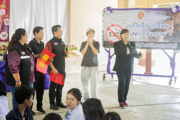 วันที่ 4 ก.ย. 2567 ศูนย์ข่าวธันเดอร์นิวส์ประจำจังหวัดสุราษฎร์ธานี โดยนางมารศรี สุขไกว และผู้สื่อข่าวธันเดอร์นิวส์ร่วมกับ ศูนย์ข่าวเมืองคนดีนิวส์ โดย บก.ป้อม เมืองคนดี ลงพื้นที่ วิทยาลัยเทคนิคกาญจนดิษฐ์ อ.กาญจนดิษฐ์ จ.สุราษฎร์ธานี ได้ให้ความรู้ในเรื่องของโทษและพิษภัยของบุหรี่ไฟฟ้า อันตรายจากบุหรี่ไฟฟ้า ผลกระทบที่ได้รับจากการสูบบุหรี่ไฟฟ้า กฎหมายที่เกี่ยวข้องกับบุหรี่ไฟฟ้า กฎหมายที่เกี่ยวข้องกับบุหรี่ไฟฟ้า ซึ่งมีนักศึกษาเข้าร่วมกิจกรรมจำนวน 100 คน ภายใต้การต้อนรับจาก ดร.สุธีร์ ไทยเกิด ผู้อำนวยการวิทยาลัยเทคนิคกาญจนดิษฐ์ และคณะครูอาจารย์ พร้อมกันนี้ศูนย์ข่าวธันเดอร์นิวส์ประจำจังหวัดสุราษฎร์ธานีได้มอบบันทึกข้อตกลงความร่วมมือ( MOU) ซึ่งได้ลงนามไว้เป็นที่เรียบร้อยแล้วเมื่อวันที่ 17 มิถุนายน 2567 เพื่อให้สถานศึกษาได้ดำเนินการ 7 มาตรการ เพื่อโรงเรียนปลอดบุหรี่ต่อไป