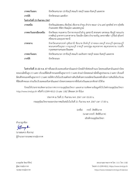 ช่วงวันที่ 22 กันยายน 2567 ภาคเหนือ:จังหวัดแม่ฮ่องสอน เชียงใหม่ เชียงราย ลำพูน ลำปาง พะเยา น่าน แพร่ อุตรดิตถ์ ตาก สุโขทัย กำแพงเพชร พิจิตร พิษณุโลก และเพชรบูรณ์ ภาคตะวันออกเฉียงเหนือ: จังหวัดเลย หนองคาย บึงกาฬ หนองบัวลำภู อุดรธานี สกลนคร นครพนม ชัยภูมิ ขอนแก่น กาฬสินธุ์ มุกดาหาร มหาสารคาม ร้อยเอ็ด ยโสธร อำนาจเจริญ นครราชสีมา บุรีรัมย์ สุรินทร์ ศรีสะเกษ และอุบลราชธานี ภาคกลาง : จังหวัดนครสวรรค์ อุทัยธานี ชัยนาท ลพบุรี สระบุรี พระนครศรีอยุธยา กาญจนบุรี ราชบุรี นครปฐม สมุทรสาคร สมุทรสงคราม รวมทั้งกรุงเทพมหานครและปริมณฑล ภาคตะวันออก: จังหวัดนครนายก ปราจีนบุรี สระแก้ว ชลบุรี ระยอง จันทบุรี และตราด ภาคใต้:จังหวัดระนอง และพังงา