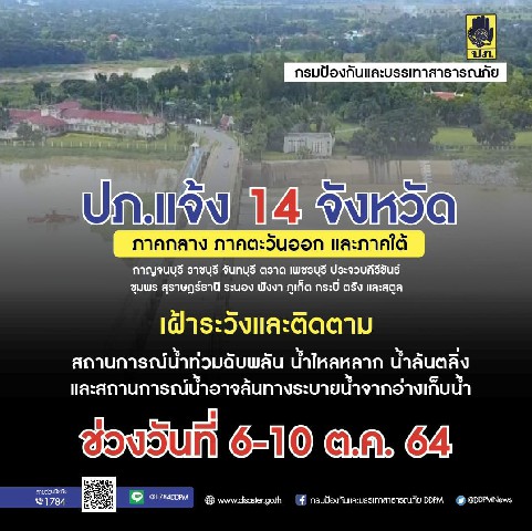 กรมป้องกันและบรรเทาสาธารณภัย (ปภ.).แจ้ง 14 จังหวัดภาคกลาง – ตะวันออก – ใต้ เฝ้าระวังน้ำท่วมฉับพลัน น้ำไหลหลาก น้ำล้นตลิ่ง น้ำอาจล้นทางระบายน้ำจากอ่างเก็บน้ำ ในช่วงวันที่ 6-10 ต.ค. 64