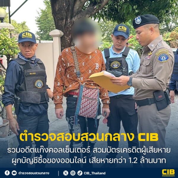 ตำรวจสอบสวนกลาง (CIB) รวบอดีตแก๊งคอลเซ็นเตอร์ สวมบัตรเครดิตผู้เสียหาย ผูกบัญชีซื้อของออนไลน์ เสียหายกว่า 1.2 ล้านบาท