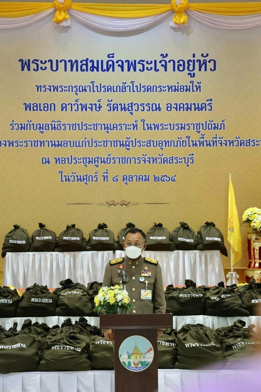 ต่อจากนั้น พระบาทสมเด็จพระเจ้าอยู่หัว ทรงพระกรุณาโปรดเกล้าฯ ให้ พลเอก ดาว์พงษ์ รัตนสุวรรณ องคมนตรี ร่วมกับมูลนิธิราชประชานุเคราะห์ ในพระบรมราชูปถัมภ์ เชิญถุงพระราชทานและเครื่องอุปโภคบริโภค จำนวน 2,500 ถุง ไปมอบแก่ผู้ว่าราชการจังหวัด และนายอำเภอต่างๆ ซึ่งเป็นตัวแทนราษฎรที่ประสบอุทกภัย ณ หอประชุมศูนย์ราชการจังหวัดสระบุรี จังหวัดสระบุรี เพื่อช่วยบรรเทาความเดือดร้อนในเบื้องต้น และเป็นขวัญกำลังใจแก่ผู้ประสบอุทกภัยและผู้ที่ได้รับผลกระทบ