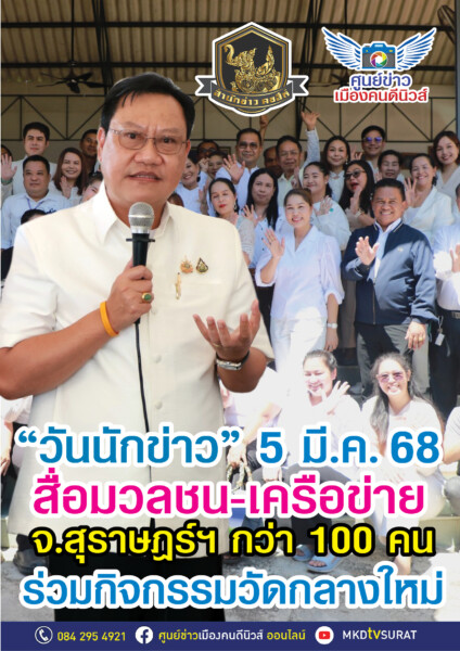 วันที่ 5 มี.ค.68 ณ วัดกลางใหม่ อำเภอเมืองฯ จังหวัดสุราษฎร์ธานี นายวิทศักดิ์ จำเริญนุสิต รองผู้ว่าราชการจังหวัดสุราษฎร์ธานี เป็นประธานในกิจกรรมทำบุญอุทิศส่วนกุศลและบำเพ็ญประโยชน์ เนื่องใน “วันนักข่าว” ประจำปี 2568 โดยมี พระครูปริยัติคุณาวุธ (เสรี ภูริปัญโญ ) รองเจ้าคณะจังหวัดสุราษฎร์ธานี เจ้าอาวาสวัดกลางใหม่ อำเภอเมืองฯ จ.สุราษฎร์ธานี เป็นประธานฝ่ายสงฆ์ ซึ่งมีนายธีรพงศ์ เพชรรัตน์ ผู้อำนวยการสำนักประชาสัมพันธ์เขต 5 พร้อมด้วย นางทัศนียาพร ดวงแก้ว ประชาสัมพันธ์จังหวัดสุราษฎร์ธานี (ปชส.ผู้แทนภาค 5) , นายชวลิต โรจนรัตน์ นายอำเภอเมืองสุราษฎร์ธานี ,สมาคมนักสื่อสารมวลชนสุราษฎร์ธานี ,สมาคมวิชาชีพวิทยุ-โทรทัศน์และหนังสือพิมพ์สุราษฎร์ธานี ,สมาคมนักข่าวสุราษฎร์ธานี ,สมาคมสื่อภูมิภาคสุราษฎร์ธานี ,ชมรมนักข่าวสุราษฎร์ธานี ,ชมรมสื่อออนไลน์เมืองร้อยเกาะและศูนย์ข่าวธันเดอร์นิวส์ประจำจังหวัดสุราษฎร์ธานี ,สถานีโทรทัศน์สุราษฎร์ธานี (NBT SOUTH ),สวท.สุราษฎร์ธานี ,สถานีวิทยุ อสมท. พร้อมสมาชิกสมาคมฯ ชมรม และสื่ออิสระ หัวหน้าส่วนราชการ และเครือข่ายสื่อมวลชนในพื้นที่ จ.สุราษฎร์ธานี และใกล้เคียง เข้าร่วมกิจกรรม กว่า 100 คน