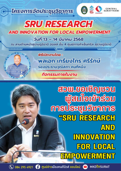 สถาบันวิจัยและพัฒนา มหาวิทยาลัยราชภัฏสุราษฎร์ธานี กำหนดจัดประชุมวิชาการ “SRU RESEARCH AND INNOVATION FOR LOCAL EMPOWERMENT” เพื่อใช้เป็นช่องทางในการส่งเสริมให้เกิดการพัฒนางานวิจัยและนวัตกรรม รวมทั้งยังเป็นเวทีสำหรับการแลกเปลี่ยนประสบการณ์และสร้างเครือข่ายความร่วมมือระหว่างผู้เข้าร่วมประชุมที่มาจากชุมชนท้องถิ่น ระหว่างวันที่ 13 – 14 มีนาคม 2568 ณ ลานด้านหน้าสุราษฎร์ธานี ฮอลล์ ชั้น 4 ศูนย์การค้าเซ็ฯทรัล สุราษฎร์ธานี