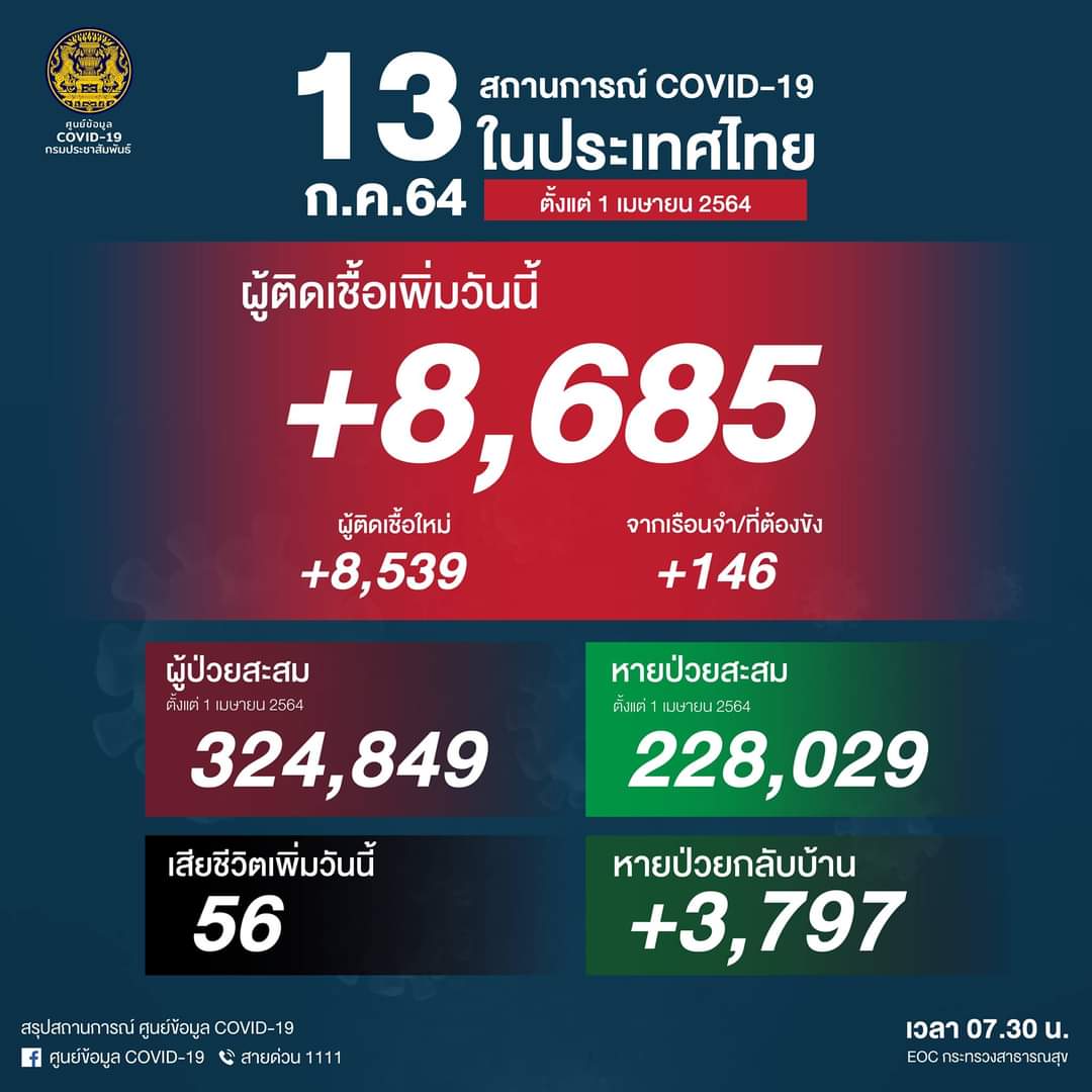 ล่าสุด สถานการณ์การแพร่ระบาดของโรคติดเชื้อไวรัสโคโรนา 2019 (COVID-19) หรือ โควิด-19 ในไทยวันนี้ พบผู้ติดเชื้อรายใหม่เพิ่ม 8,685 ราย แบ่งเป็นผู้ติดเชื้อใหม่ 8,539 ราย และผู้ติดเชื้อในเรือนจำ 146 ราย ยอดติดเชื้อรวมระลอกเมษายน 353,712 ราย รวมยอดติดเชื้อสะสม 353,712 ราย เสียชีวิตเพิ่ม 56 ราย เสียชีวิตสะสม 2,847 ราย หายป่วยเพิ่ม 3,797 ราย รวมหายป่วยสะสม 255,455 ราย