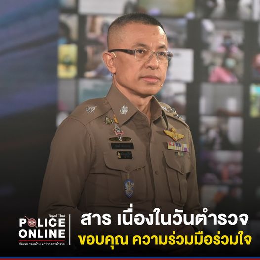 ขอขอบคุณในสำนึกของความเป็นผู้พิทักษ์สันติราษฎร์ ความทุ่มเท ความเสียสละ รวมทั้งความร่วมมือร่วมใจของพวกท่านทั้งหลาย ในการปฏิบัติหน้าที่เป็นที่พึ่งของพี่น้องประชาชน ขอขอบคุณสมาชิกครอบครัวข้าราชการตำรวจที่อยู่เคียงข้างร่วมทุกข์ร่วมสุข เป็นขวัญกำลังใจให้พวกเราได้สานต่ออุดมการณ์ของการเป็นผู้พิทักษ์สันติราษฎร์ไปด้วยกัน