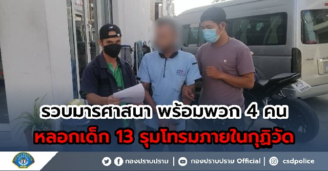 กองปราบรวบผู้ต้องหาพร้อมพวก 4 คน ซึ่งบวชเป็นพระหลอกเด็ก 13 มารุมโทรมภายในกุฏิวัด หลังสึกออกมาแล้วหลบหนีไปอยู่ต่างจังหวัด พบประวัติต้องคดีจำคุกมาหลายครั้ง