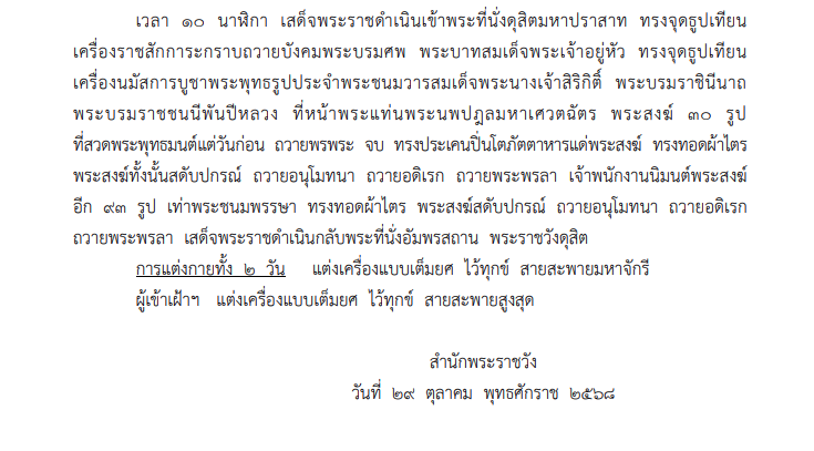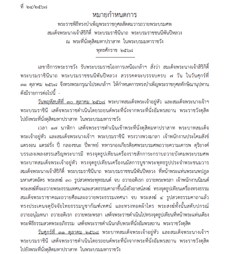ราชกิจจานุเบกษาเผยแพร่ หมายกำหนดการพระราชพิธีทรงบำเพ็ญพระราชกุศลสัตตมวารถวายพระบรมศพสมเด็จพระนางเจ้าสิริกิติ์ พระบรมราชินีนาถ พระบรมราชชนนีพันปีหลวง ณ พระที่นั่งดุสิตมหาปราสาท ในพระบรมมหาราชวัง พุทธศักราช 2568