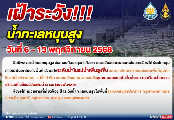 สำนักงานทรัพยากรน้ำแห่งชาติ เตือน!! เฝ้าระวัง “น้ำทะเลหนุนสูง” ช่วงวันที่ 6 – 13 พ.ย. 2568