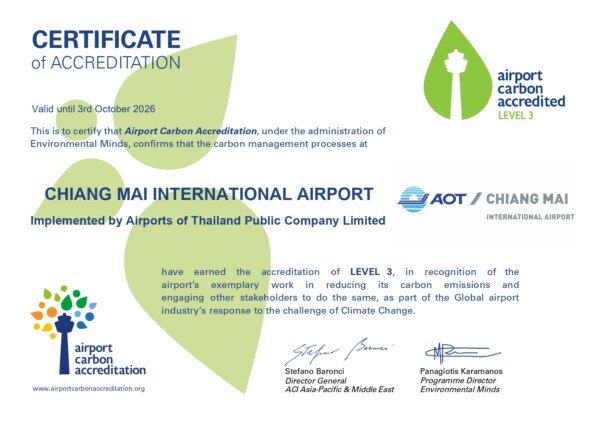บริษัท ท่าอากาศยานไทย จำกัด (มหาชน) (AOT) เดินหน้ารักษามาตรฐานความยั่งยืนด้านสิ่งแวดล้อมอย่างต่อเนื่อง โดยท่าอากาศยานสุวรรณภูมิ (ทสภ.) ท่าอากาศยานดอนเมือง (ทดม.) ท่าอากาศยานเชียงใหม่ (ทชม.) ท่าอากาศยานแม่ฟ้าหลวง เชียงราย (ทชร.) และท่าอากาศยานหาดใหญ่ (ทหญ.) ได้รับการรับรองตามโปรแกรม Airport Carbon Accreditation (ACA) ของ Airports Council International (ACI) ในระดับที่ 3 Optimisation ท่าอากาศยานภูเก็ต (ทภก.) ได้รับการรับรองในระดับที่ 2 Reduction