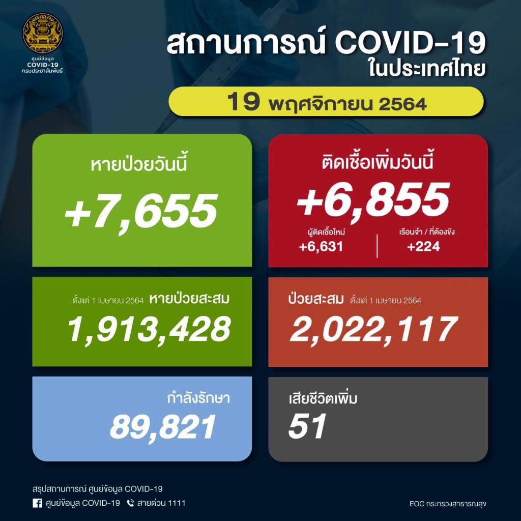 วันนี้ (19 พ.ย.) เมื่อเวลา 07.30 น. ศูนย์ปฏิบัติการภาวะฉุกเฉิน กรมควบคุมโรค กระทรวงสาธารณสุข เผยตัวเลขสถานการณ์การแพร่ระบาดของโควิด-19 ในประเทศไทย ว่า