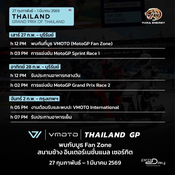 การปรากฏตัวร่วมกันของ VMOTO และ TORA ในงาน Thailand Grand Prix 2026 ครั้งนี้ จึงไม่เพียงเป็นการเปิดตัวอย่างเป็นทางการในตลาดประเทศไทย หากยังเป็นก้าวสำคัญในการเร่งการยอมรับและการเติบโตของ Electric Mobility ในประเทศไทย และขยายผลสู่ภูมิภาคเอเชียตะวันออกเฉียงใต้อย่างยั่งยืน