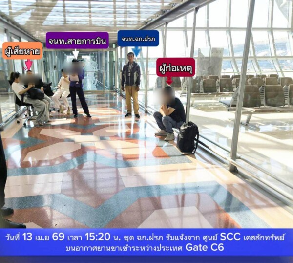 เมื่อวันที่ 13 เมษายน 2569 เวลา 15.20 น. ศูนย์รักษาความปลอดภัยท่าอากาศยานสุวรรณภูมิ ได้รับแจ้งจากเจ้าหน้าที่สายการบิน ว่ามีผู้โดยสารชาวจีนอายุ 45 ปี ซึ่งเดินทางมาจากเวียงจันทน์แจ้งทรัพย์สินสูญหายเป็นเงินสด