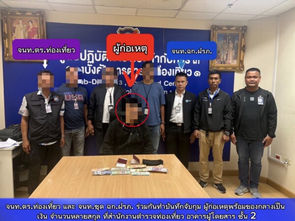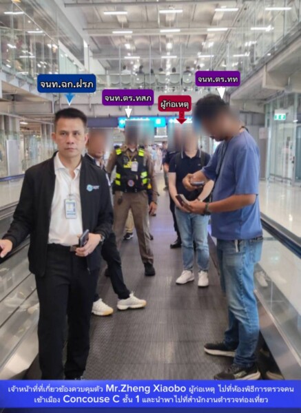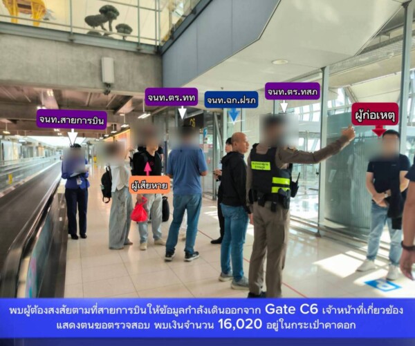 ทั้งนี้ภายหลังได้รับแจ้งเหตุดังกล่าว ศูนย์รักษาความปลอดภัยท่าอากาศยานสุวรรณภูมิ จึงได้ประสานเจ้าหน้าที่ชุดเฉพาะกิจฝ่ายรักษาความปลอดภัย ทสภ. (ฉก.ฝรภ.ทสภ.) และสถานีตำรวจภูธรท่าอากาศยานสุวรรณภูมิ (สภ.ทสภ.) พร้อมด้วยกองกำกับการ 3 กองบังคับการตำรวจท่องเที่ยว 1 เข้าพื้นที่บริเวณหน้า Gate C6 เพื่อเข้าตรวจสอบเหตุการณ์ดังกล่าวทันทีเมื่ออากาศยานเดินทางถึง ทสภ. กระทั่งพบบุคคลต้องสงสัย จึงได้แสดงตัวเข้าทำการตรวจค้นและควบคุมตัว จากการตรวจค้นพบเงินสดจำนวน 16,020 บาท ซุกซ่อนอยู่ภายในกระเป๋าคาดอกสีดำของผู้ต้องสงสัย ซึ่งเป็นชายสัญชาติจีน อายุ 41 ปี ซึ่งโดยสารมากับเที่ยวบินเดียวกัน โดยผู้ต้องสงสัยให้การรับสารภาพว่าเป็นผู้ก่อเหตุจริง เจ้าหน้าที่จึงได้ควบคุมตัวส่งพนักงานสอบสวน สภ.ทสภ. เพื่อดำเนินคดีตามกฎหมายต่อไป