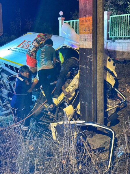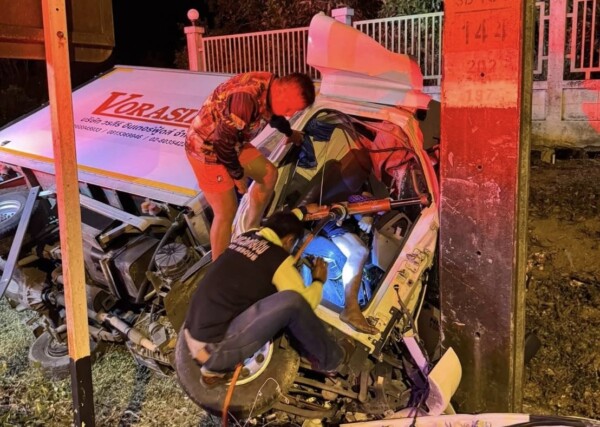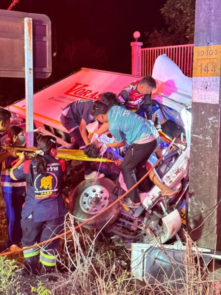 รถบรรทุก 4 ล้อ ส่งสินค้า เสียหลักชนเสาไฟฟ้า บาดเจ็บติดภายใน 1 ราย บริเวณหน้า อสมท. อ.เมือง จ.สระแก้ว