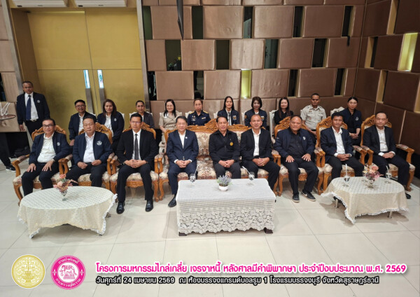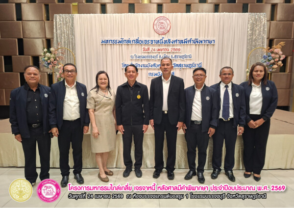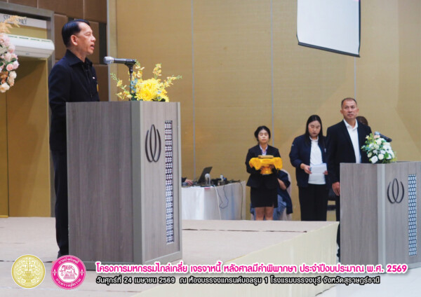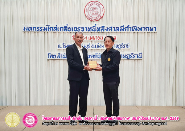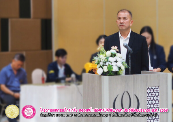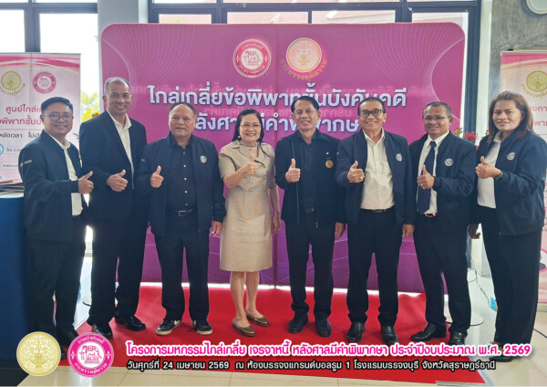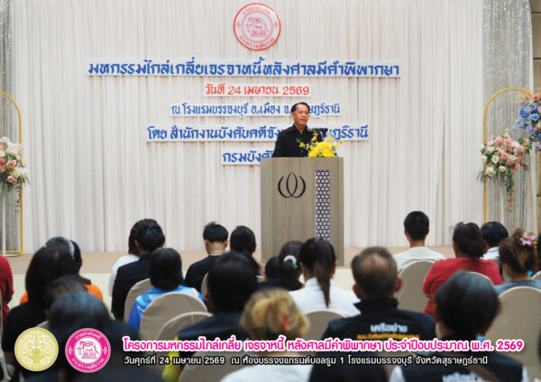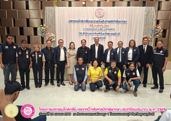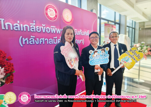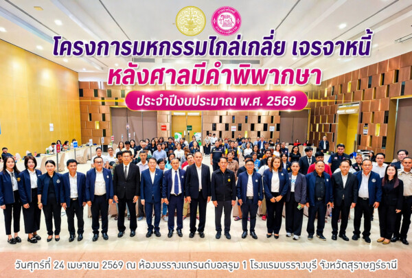“โครงการมหกรรมไกล่เกลี่ย เจรจาหนี้ หลังศาลมีคำพิพากษา ประจำปีงบประมาณ พ.ศ. 2569” เวทีสำคัญที่เปิดโอกาสให้ลูกหนี้ได้ “ปลดล็อกภาระหนี้” และก้าวสู่การเริ่มต้นใหม่ทางการเงินอย่างยั่งยืน จัดขึ้นเมื่อวันศุกร์ที่ 24 เมษายน 2569 ณ ห้องแกรนด์บอลรูม 1 โรงแรมบรรจงบุรี จังหวัดสุราษฎร์ธานี