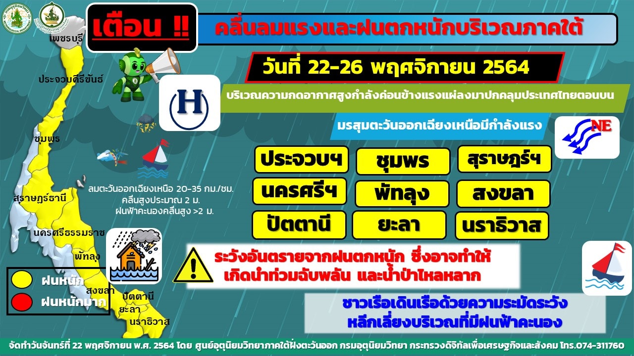บริเวณความกดอากาศสูงกําลังค่อนข้างแรงระลอกใหม่จากประเทศจีนได้แผ่ลงมาปกคลุม ประเทศเวียดนามตอนบนแล้ว ส่งผลให้มรสุมตะวันออกเฉียงเหนือที่พัดปกคลุมอ่าวไทย และภาคใต้มีกําลัง แรงขึ้น ประกอบกับมีหย่อมความกดอากาศต่ําปกคลุมบริเวณชายฝั่งประเทศมาเลเซียตอนบน ทําให้ใน ช่วงวันที่ 22-26 พ.ย. 64 บริเวณภาคใต้ฝั่งตะวันออกจะมีฝนตกหนักหลายพื้นที่ และมีฝนหนักมาก บางแห่ง ลักษณะดังกล่าวส่งผลกระทบต่อภาคใต้ฝั่งตะวันออก ดังนี้