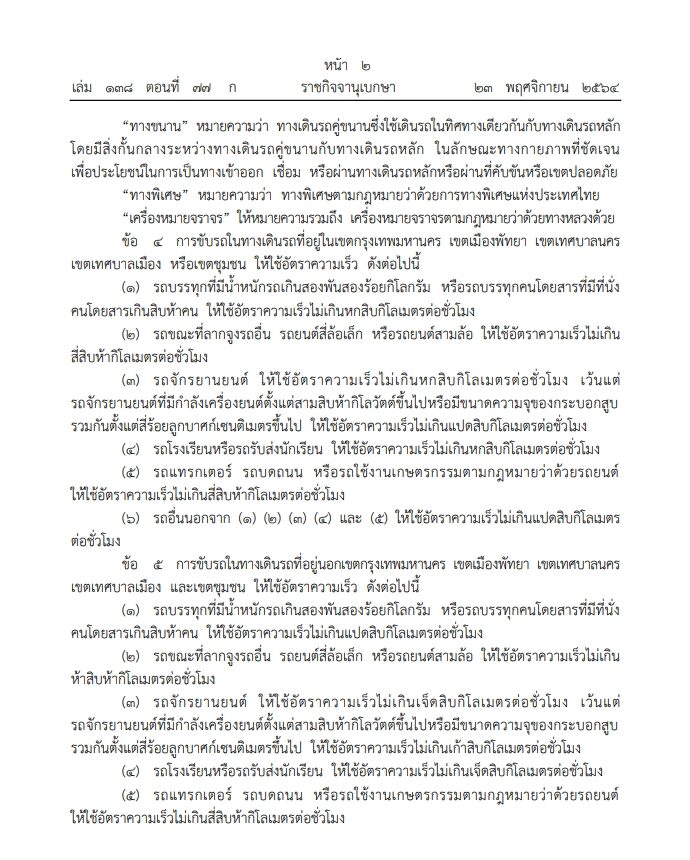 เมื่อวันที่ 23 พฤศจิกายน เว็บไซต์ ราชกิจจานุเบกษา เผยแพร่ กฎกระทรวง กำหนดอัตราความเร็วสำหรับการขับรถในทางเดินรถ พ.ศ.2564