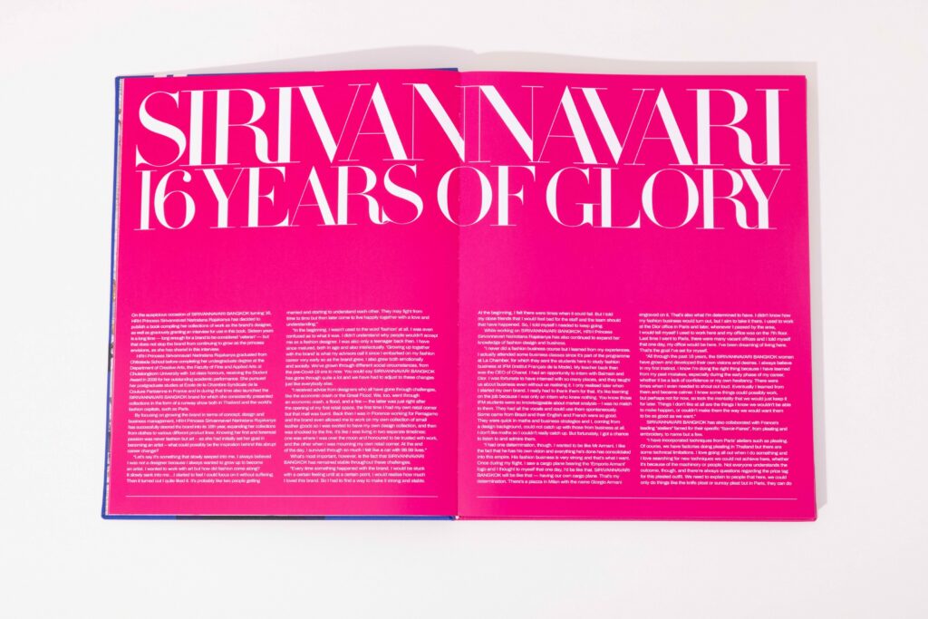 “เริ่มต้นจากการไปร้านหนังสือต่างๆ ทำให้ได้เห็นหนังสือแฟชั่นของแบรนด์ต่างๆ จึงเป็นแรงบันดาลใจที่ทำให้เกิดหนังสือเล่มนี้ ซึ่งเปรียบเสมือนความฝันที่เป็นจริง ข้าพเจ้าเคยมีความฝันไว้ว่าอยากมีหนังสือแฟชั่นเป็นของตัวเอง เป็นหนังสือที่รวบรวมผลงานของข้าพเจ้าและแบรนด์ SIRIVANNAVARI BANGKOK ตั้งแต่เริ่มก่อตั้งจนถึงวันนี้ รวมทั้งตั้งใจให้หนังสือเล่มนี้มอบโอกาสให้คนในวงการแฟชั่นรุ่นหลัง ๆ ได้ศึกษาเรียนรู้”