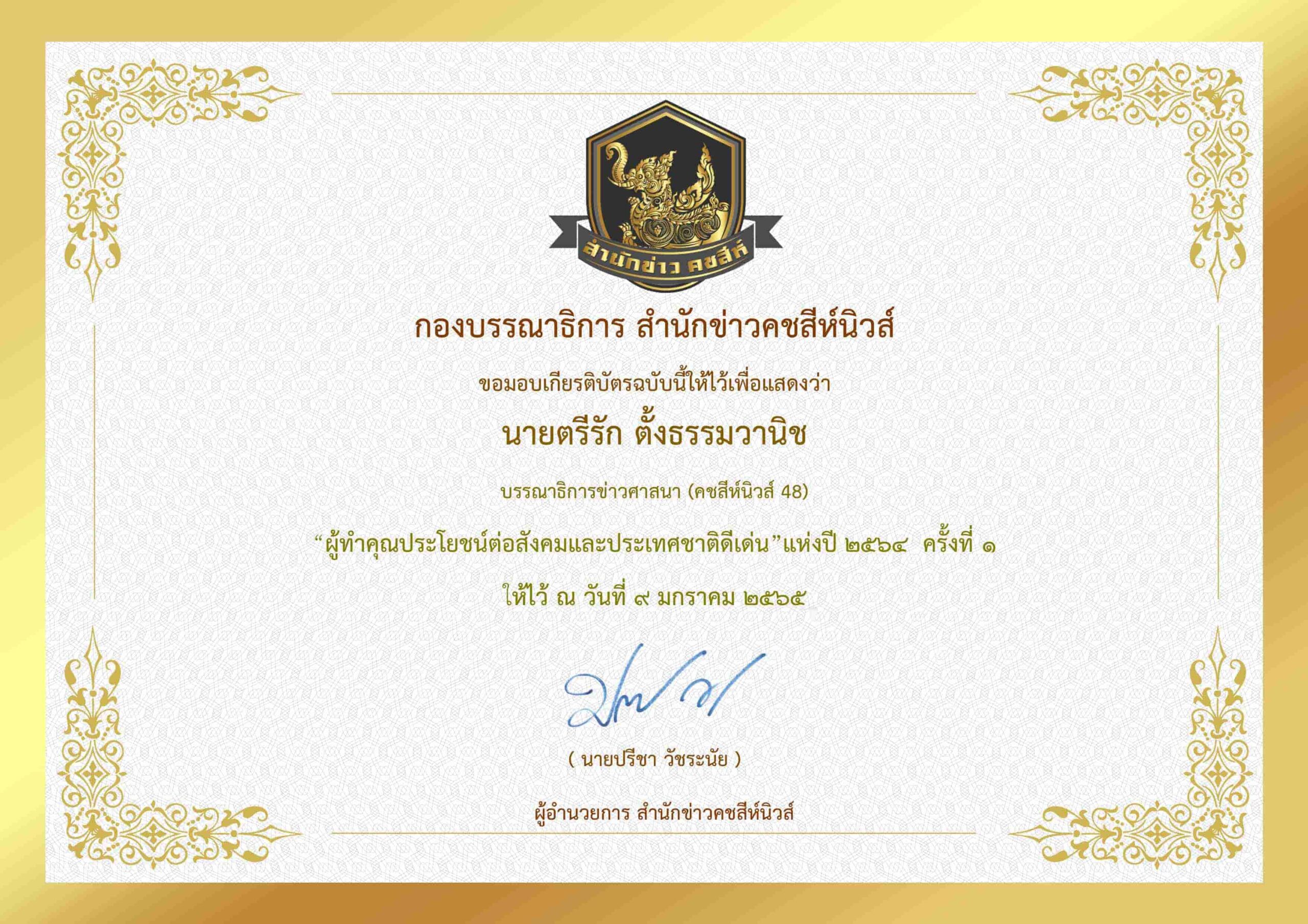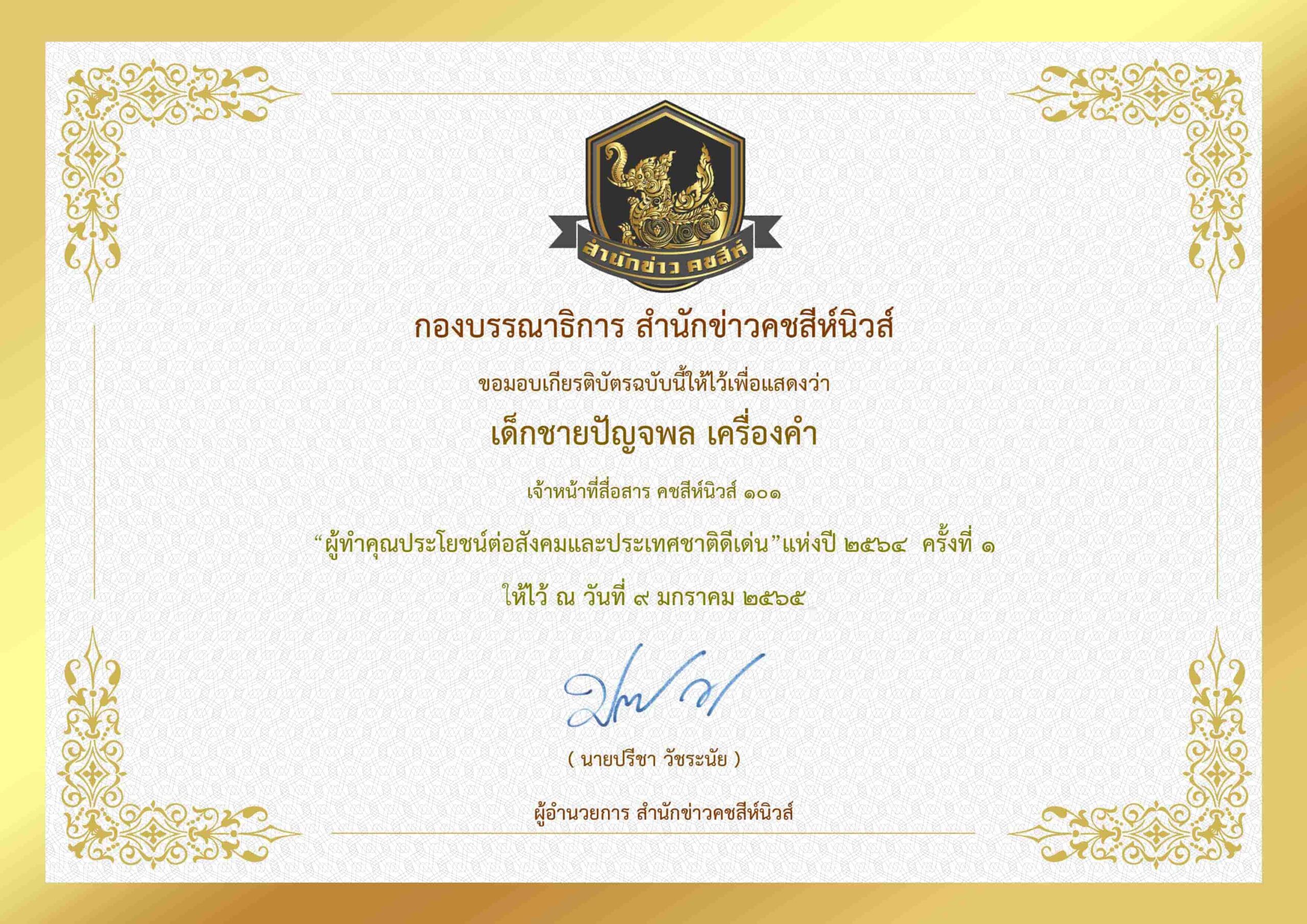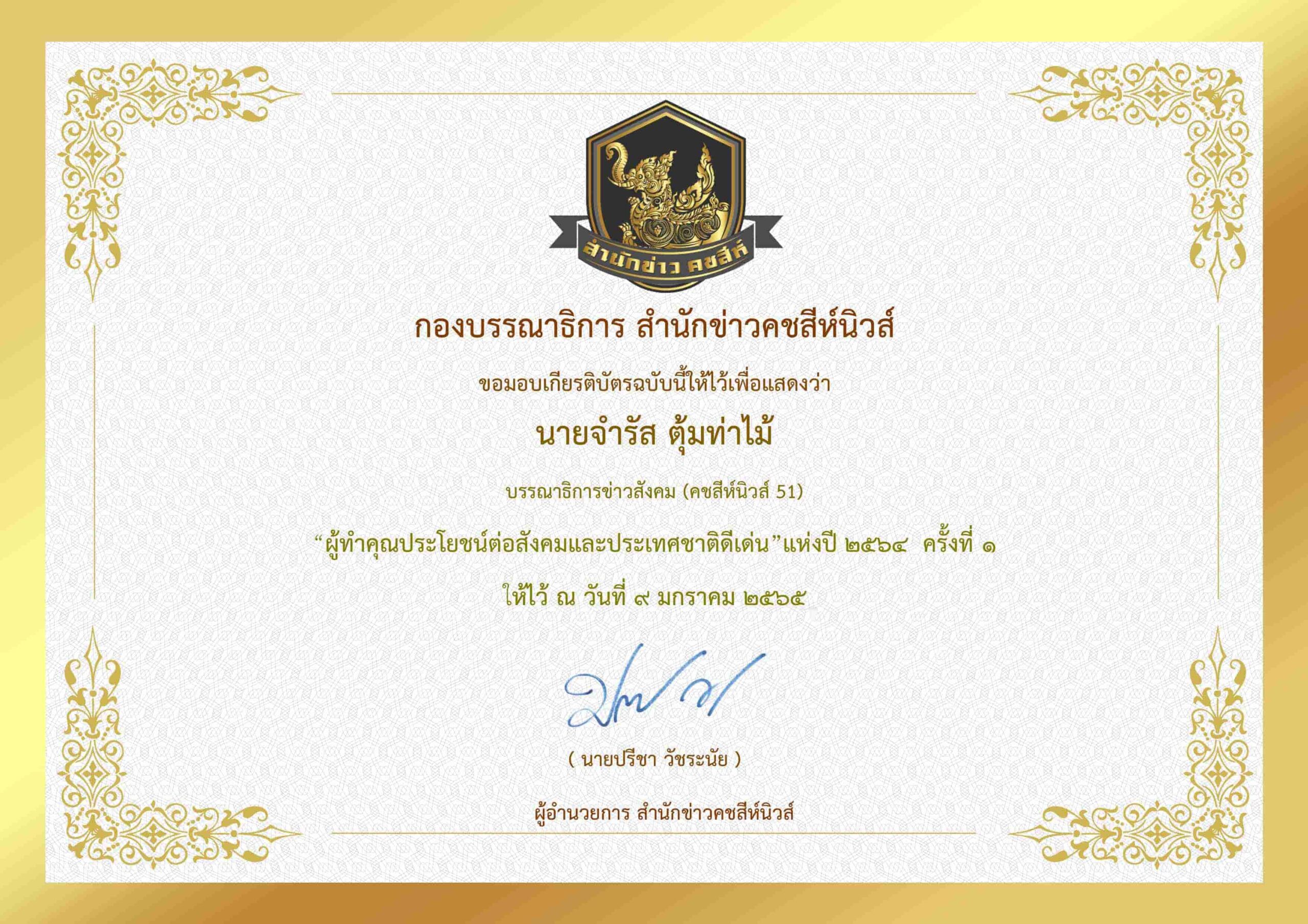 บริษัท มหามงคล เทเลคอม 2020 จำกัด ผู้จัดตั้ง กองบรรณาธิการสำนักข่าวคชสีห์ ขอแสดงความยินดีบริษัท กลางคุ้มครองผู้ประสบภัยจากรถ จำกัดพร้อมด้วยทีมกองบรรณาธิการ รวม 15 ท่าน ได้รับมอบเกียรติบัตร “ผู้ทำคุณประโยชน์ต่อสังคมและประเทศชาติดีเด่น”แห่งปี ๒๕๖๔ ครั้งที่ ๑