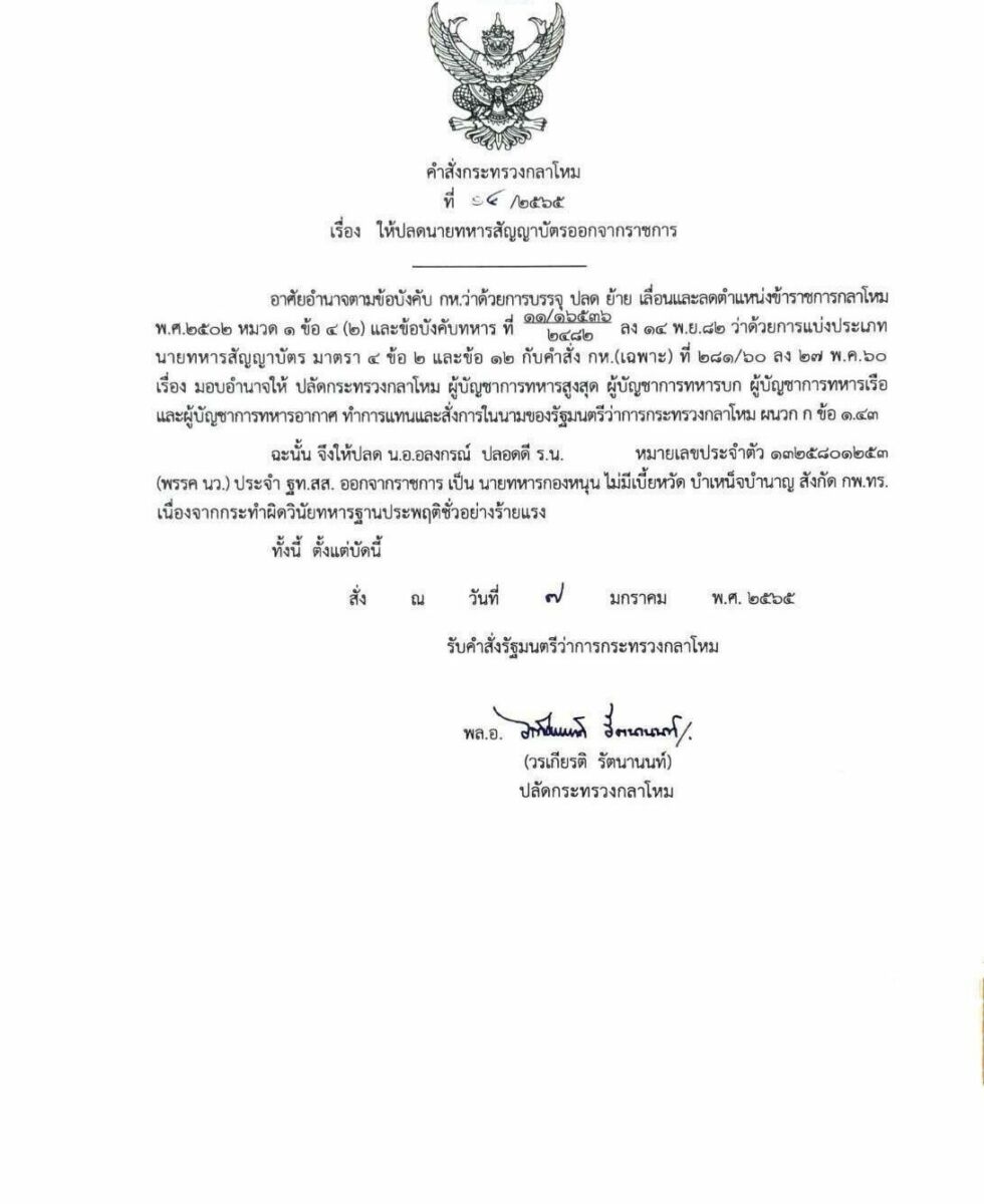 เนื่องจากกระทำผิดวินัยทหารฐานประพฤติชั่วอย่างร้ายแรง ทั้งนี้ ตั้งแต่บัดนี้ สั่ง ณ วันที่ 7 มกราคม 2565
