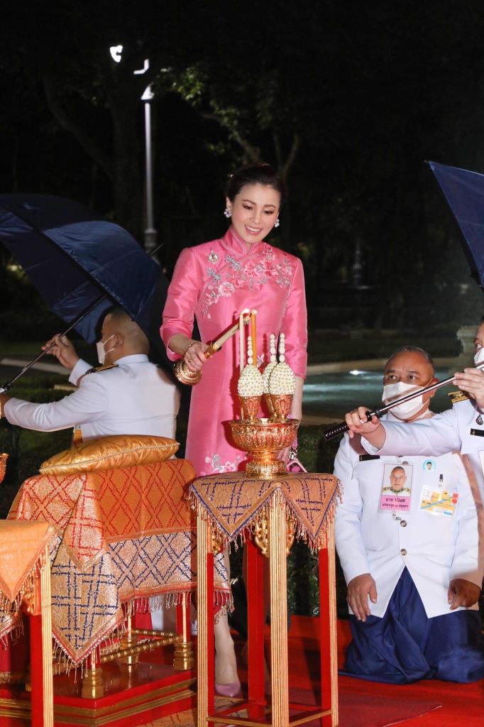 ทรงจุดธูปหางแล้วทรงปักที่เครื่องสังเวย สมเด็จพระนางเจ้า ฯ พระบรมราชินี ทรงจุดธูปหางแล้ว