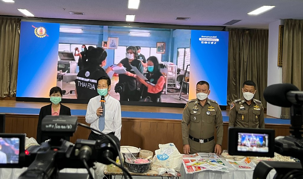 วันที่ 3 ก.พ. 2565 พล.ต.ท.จิรภพ ภูริเดช ผบช.ก., พล.ต.ต.ณัฐศักดิ์ เชาวนาศัย รอง ผบช.ก., พล.ต.ต.อนันต์ นานาสมบัติ ผบก.ปคบ., พ.ต.อ.ธรากร เลิศพรเจริญ รอง ผบก.ปอท.รรท.รอง ผบก.ปคบ., พ.ต.อ.เนติ วงษ์กุหลาบ ผกก.4 บก.ปคบ., พ.ต.อ.นิทัศน์ แหวนประดับ ผกก.สภ.เมืองชลบุรี, สำนักงานคณะกรรมการอาหารและยา โดย นพ.ไพศาล ดั่นคุ้ม เลขาธิการคณะกรรมการอาหารและยา, นพ.วิทิต สฤษฎีชัยกุล รองเลขาธิการคณะกรรมการอาหารและยา, น.ส.อรสุรางค์ ธีระวัฒน์ ผู้เชี่ยวชาญด้านมาตรฐานอาหาร ร่วมกันแถลงผลการปฏิบัติงาน กรณีจับกุมแหล่งผลิตไส้กรอกปนเปื้อนพื้นที่ จ.ชลบุรี ตรวจยึดของกลาง 32 รายการ มูลค่ากว่า 700,000 บาท
