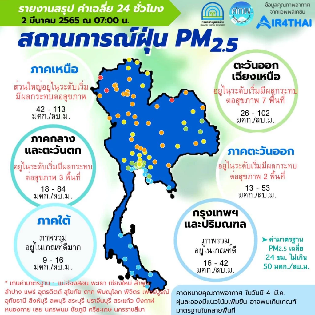 เกาะติด “ฝุ่น PM2.5” คุณภาพอากาศเช้านี้ (2 มี.ค.65) พบเกินค่ามาตรฐาน 25 จังหวัด ศูนย์แก้ไขปัญหามลพิษทางอากาศ(ศกพ.) รายงานการติดตามตรวจสอบคุณภาพอากาศประจำวันที่ 2 มีนาคม​ 2565 ณ เวลา 07:00 น สรุปดังนี้