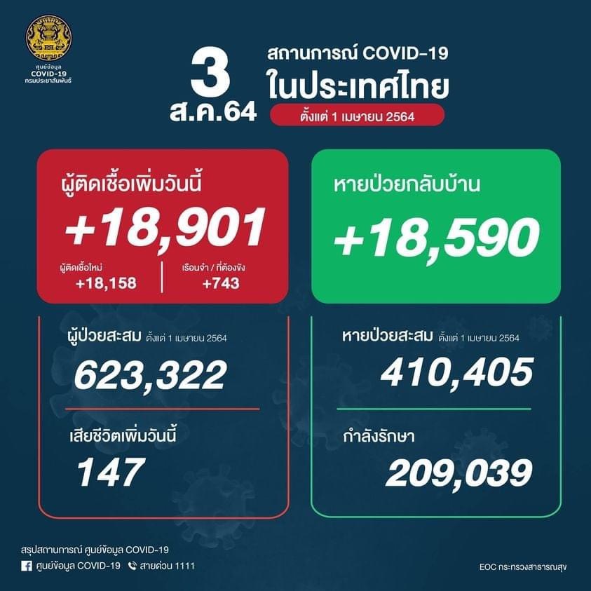 ล่าสุด สถานการณ์การแพร่ระบาดของโรคติดเชื้อไวรัสโคโรนา 2019 (COVID-19) หรือ โควิด-19 ในไทยวันนี้ พบผู้ติดเชื้อรายใหม่เพิ่ม 18,901 ราย แบ่งเป็นผู้ติดเชื้อใหม่ 18,158 ราย และผู้ติดเชื้อในเรือนจำ 743 ราย ยอดติดเชื้อรวมระลอกเมษายน 623,322 ราย รวมยอดติดเชื้อสะสม 652,185 ราย เสียชีวิตเพิ่ม 147 ราย เสียชีวิตสะสม 5,315 ราย หายป่วยเพิ่ม 18,590 ราย รักษาตัวอยู่ 209,039 ราย