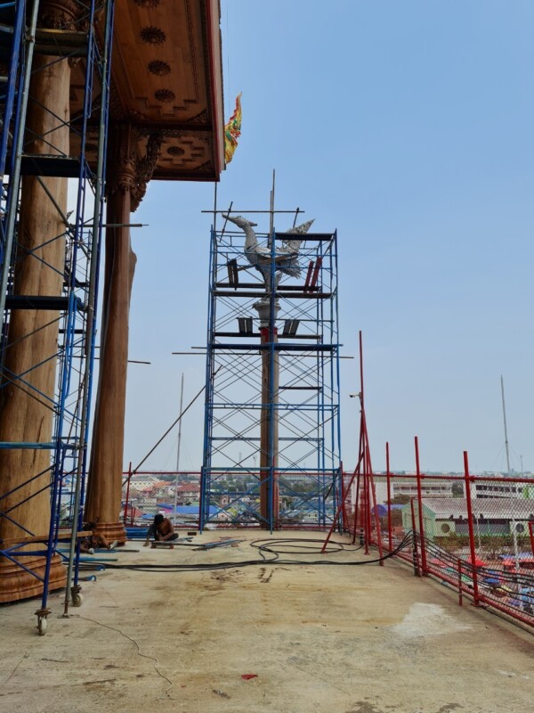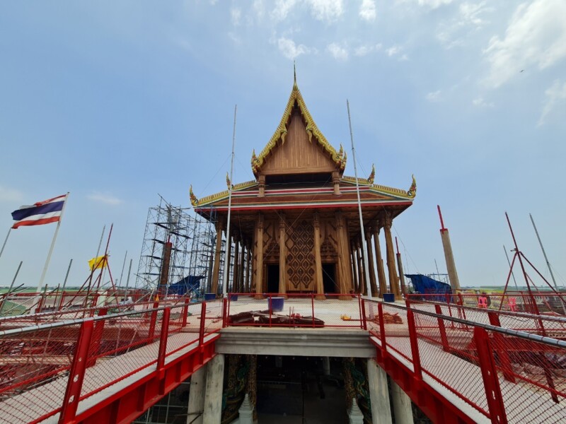 การสร้างโบสถ์ครั้งแรกคิดว่าน่าจะสร้างให้สูงหน่อย เพราะพื้นที่บริเวณวัดน้ำท้วม และพื้นดินจะทรุดทุกปีปีละไม่ต่ำกว่า ๒-๓ ซม. ในขณะที่น้ำทะเลก็หนุนสูงของ ๒-๓ ซม.เช่นกัน พอดีญาติโยมหลายท่านที่เดินทางมากราบไหว้พระพุทธรูปหลวงพ่อปู่ มาเล่าให้ฟังว่าฝันว่าได้เข้ามากราบหลวงพ่อปู่ที่อยู่ในโบสถ์สูงลอยอยู่บนท้องฟ้า เราก็อดแปลกใจไม่ได้ เพราะว่ามีญาติโยมหลายคนที่พูดในทำนองเดียวกันว่ามากราบหลวงพ่อปู่ ที่มีโบสถ์ลอยอยู่บนท้องฟ้า