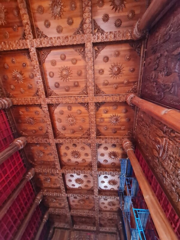 ก่อนสร้างโบสถ์ได้ไปเสี่ยงทายหลายหลวงปู่ โดยใช้ไม้เสี่ยงทาย คว่ำหงาย ที่เรียกว่า เส้งโปย หรืออิ้นโปย ถามหลวงพ่อปู่ว่า ถ้าจะสร้างโบสถ์ที่สูงลอยฟ้าจะสร้างได้สำเร็จหรือไม่ โดยโยนโปย เสี่ยงทายถามว่าจะสำเร็จหรือไม่ ถ้าใช่ขอให้โปยคว่ำกับหงาย ปรากฏว่าโปยเสี่ยงทายคว่ำหงาย ทำอยู่ ๓ ครั้ง ซึ่งแสดงว่าสำเร็จ จึงได้ลงมือก่อสร้างโบสถ์สูงลอยฟ้า