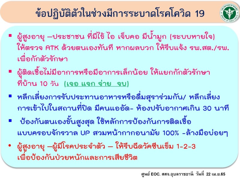 เตือน!!!กลุ่มผู้สูงอายุ กลุ่ม 608 ผู้ป่วยติดเตียง ประชาชนทุกคนในจังหวัดอุบลฯหากมีอาการ ไข้ ไอ เจ็บคอ มีน้ำมูก จมูกไม่ได้กลิ่น ลิ้นไม่รับรส หอบเหนื่อย เหงื่อออกเวลากลางคืน เพียง 1 อาการ ให้รีบตรวจ ATK ทันที หากผลบวก แจ้ง จนท.สธ หรือ รพ.ใกล้บ้านทันทีเพื่อป้องกันการเสียชีวิต