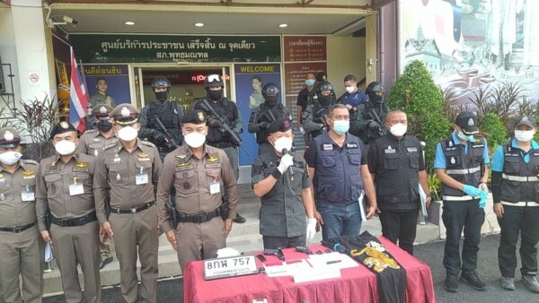 พร้อมของกลาง รถยนต์โตโยต้า รุ่นฟอร์จูนเนอร์ สีขาว ทะเบียน 8 ทฬ – 757 กทม. อาวุธปืนพกสั้น ขนาด 4 มม. สีดำ ยี่ห้อซิกซาวเออร์ รุ่น พี่ 938 หมายเลขทะเบียน กท 5630558 อาวุธปืนพกสั้นกึ่งอัตโนมัติ ยี่ห้อ COLT GOVERNMENT MODEL ขนาด 45 มม. ไม่มี ทะเบียนปืน และไม่มีหมายเลขประจำปืน จำนวน 1 กระบอก (ที่ใช้ในการก่อเหตุ) ซองกระสุนขนาด 9 มม. 5 ซอง เครื่องกระสุนขนาด 9 มม.12 นัด ปลอกกระสุนปืน ขนาด 38 จํานวน 1 ปลอก กางเกงขายาวลายเสือ แผ่นป้ายทะเบียนรถ ทะเบียน 4 กพ – 75 กทม.