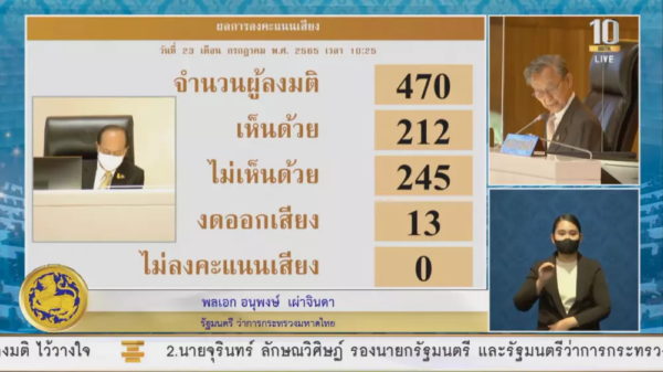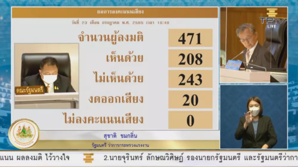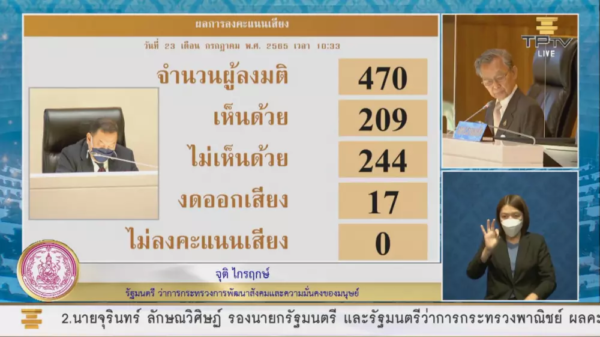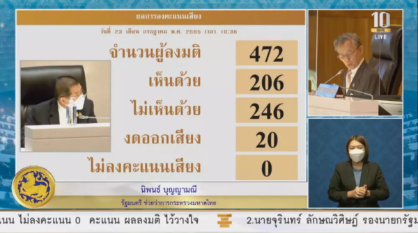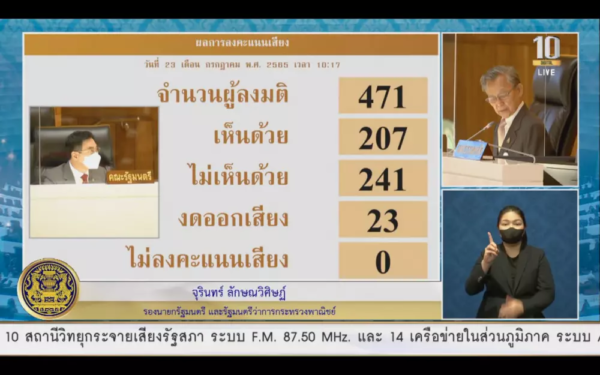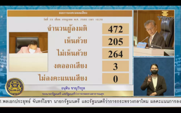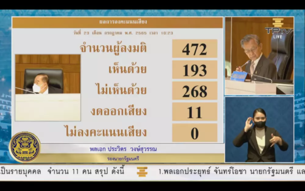 มติโหวตอภิปรายไม่ไว้วางใจ พล.อ.ประยุทธ์และรมต. รวม 11 คน รอดครบชุด “บิ๊กป้อม” ได้รับคะแนนไว้ววางใจมากที่สุด 268 นายกฯได้ 256 คะแนน “จุติ- สันติ” รอดหวุดหวิด ได้นั่งเก้าอี้รัฐมนตรีต่อ