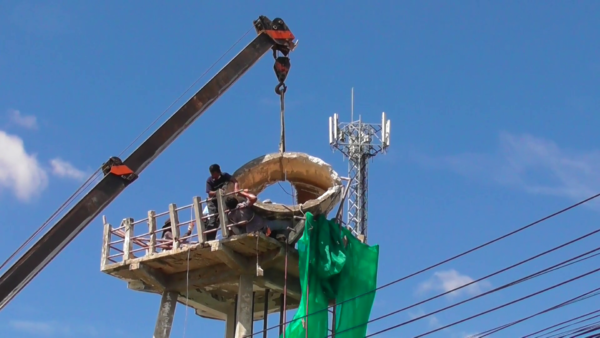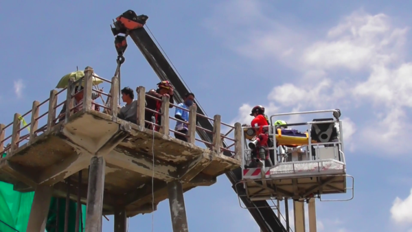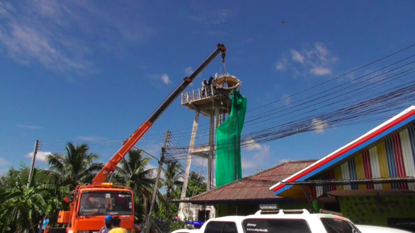 กู้ภัยเร่งช่วย 2 คนงานก่อสร้างขึ้นไปรื้อถังน้ำบาดาลเก่า สูง 10 เมตร ระหว่างทุบปูนเกิดถังปูนล้มทับตัวติดนอนแน่นิง จนต้องแจ้งกู้ภัยประสานรถกระเช้าดับเพลิงใช้เวลา 2 ชั่วโมงจึงนำออกมาได้