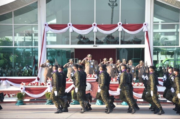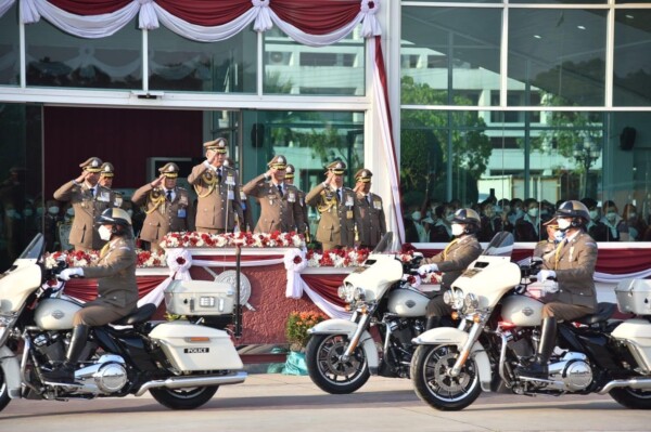 จากนั้น ผบ.ตร. ได้ขึ้นรถตรวจกำลังพลสวนสนาม และนำข้าราชการตำรวจกล่าวคำสัตย์ปฎิญาณตน ก่อนให้โอวาท พร้อมกันนั้นได้มีการเชิญธงชัยประจำกองพัน ก่อนเดินสวนสนาม