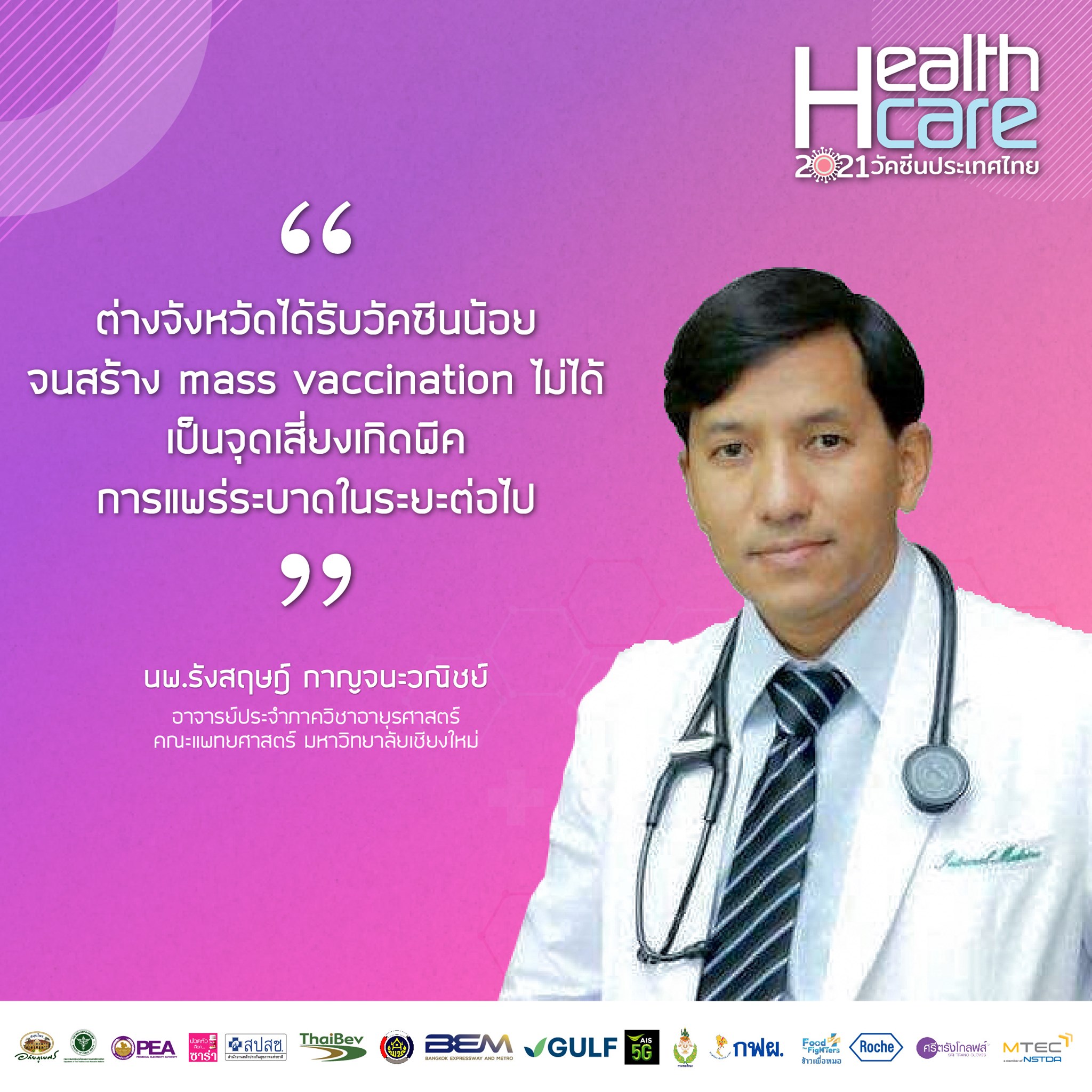 นพ.รังสฤษฎ์ กาญจนะวณิชย์ อาจารย์ประจำภาควิชาอายุรศาสตร์ คณะแพทยศาสตร์ มหาวิทยาลัยเชียงใหม่ กล่าวถึงความคืบหน้าฉีดวัคซีน โควิด 19 โดยยกกรณีตัวอย่างที่จังหวัดเชียงใหม่ ว่ามีความคืบหน้าเพียง 20 % ของเป้าหมาย เนื่องจากมีการจัดสรรวัคซีนส่วนใหญ่ให้กับกรุงเทพฯ ที่มีการแพร่ระบาดอย่างรุนแรง แต่ผลที่จะเกิดขึ้นตามมาคือ ในต่างจังหวัดไม่สามารถทำการฉีดวัคซีนให้กับประชากรจำนวนมาก( mass vaccination ) ทำให้ต่างจังหวัดอาจจะกลายเป็นจุดเสี่ยงของการแพร่ระบาดในระยะต่อไป ทั้งๆ ที่ความต้องการในการฉีดวัคซีน มีสูงโดยไม่ได้มีประเด็นการด้อยค่าวัคซีนแต่อย่างใด นพ.รังสฤษฎ์ ยังแนะนำให้ภาครัฐเรียกความเชื่อมั่นศรัทธาจากประชาชน ด้วยการสื่อสารความจริงที่รอบด้าน บนพื้นฐานความเห็นอก เห็นใจ สร้างความรู้สึกร่วม บนเวทีเสวนา “วัคซีนประเทศไทย ก้าวใหม่ฝ่าวิกฤติ” ในงาน“Healthcare 2021 วัคซีนประเทศไทย” #เราจะฝ่าวิกฤติไปด้วยกัน