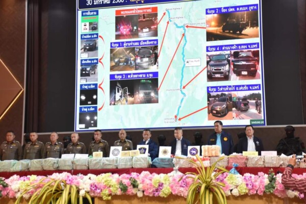ร่วมแกลง และมีเครือข่ายกองทุนแม่ของแผ่นดินจังหวัดเชียงราย ผู้นำชุมชนและประชาชน ร่วมรับฟังการแถลงข่าวครั้งนี้ด้วย โดยคดีที่ 1 เกิดขึ้นเมื่อวันที่ 30 มกราคม 2566 เวลาประมาณ 01.00 – 07.00 เจ้าหน้าที่ตำรวจ บก.สส.ภ.5, ชุดสกัดกั้นการลำเลียงยาเสพติดพื้นที่ตอนใน ภ.5, ด่านตรวจจำบอน สภ.เมืองเชียงราย จ.เชียงราย จับกุมผู้ต้องหา รวม 7 คน พร้อมของกลาง ยาบ้า 4.6 ล้าน รถยนต์ 6 คัน ที่ ทล.1020 บริเวณด่านตรวจจำบอน ต.ดอยลาน อ.เมืองเชียงราย จ.เชียงราย ทล.1021 บริเวณถนนเยื้อง ปตท.ภูซาง ต.สบบง อ.ภูซาง จ.พะเยา, ทล.1021 บริเวณ หน้าวัดห้วยยางขาม ต.ห้วยยางขาม อ.จุน จ.พะเยา, ทล.103 บริเวณด่านตรวจนางฟ้า ต.บ้านหนุน อ.สอง จ.แพร่ และ ทล.11 หน้าด่านตรวจยาเสพติดห้วยไร่ ต.ห้วยไร่ อ.เด่นชัย จ.แพร่ ต่อเนื่องและเชื่อมโยงกัน นำส่งพนักงาน สอบสวน สภ.เมืองเชียงราย จ.เชียงราย