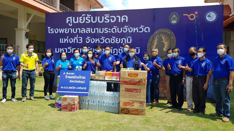 และในส่วนอาหารและน้ำดื่มรวมถึงของใช้ประจำวันที่มอบให้กับบุคลากรทางการแพทย์ และเจ้าหน้าที่ที่ปฏิบัติงานในโรงพยาบาลสนาม 3 มหาวิทยาลัยราชภัฎชัยภูมิ จำนวน 100 ชุด ในครั้งนี้เพื่อเป็นขวัญและกำลังใจให้กับบุคลากรทางการแพทย์ที่ปฏิบัติหน้าที่ในการรักษาและดูแลผู้ป่วย ต่อสู้กับไวรัสร้าย ในช่วงสถานการณ์การแพร่ระบาด และลดภาระในการจัดหาอาหารระหว่างวัน ซึ่งแสดงถึง ความห่วงใยให้กับบุคลากรทางแพทย์ ที่ดูแลผู้ป่วยหามรุ่งหามค่ำสู้วิกฤตโควิด-19 และขอให้เราช่วยฟันฝ่าวิกฤตนี้ไปให้ได้ร่วมใจคนไทยสร้างประเทศไทย ในอนาคตอีกต่อไป