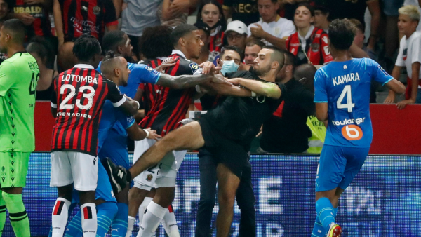 จากนั้นกองเชียร์นีซกลุ่มหนึ่งก็ลงมาในสนามโดยที่เจ้าหน้าที่รักษาความปลอดภัยไม่สามารถควบคุมสถานการณ์ได้ ก่อนเผชิญหน้ากับนักเตะมาร์กเซย กลายเป็นเหตุชุลมุนในที่สุด ซึ่งก็มีแฟนบอลรายหนึ่งถูกผลักล้มลงไปด้วย ทำให้ผู้เล่นของ นีซ ต้องรีบเข้ามาห้ามแฟนบอลของตัวเอง จนเกมต้องหยุดไปนานหลายนาที