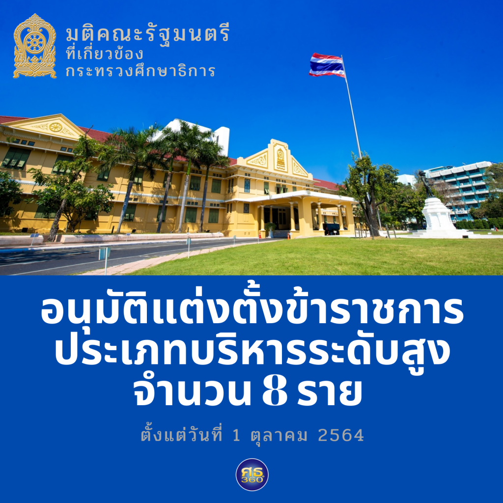 (30 สิงหาคม 2564) มติคณะรัฐมนตรี ที่เกี่ยวข้องกับกระทรวงศึกษาธิการ อนุมัติตามที่รัฐมนตรีว่าการกระทรวงศึกษาธิการเสนอแต่งตั้งข้าราชการพลเรือนสามัญ สังกัดกระทรวงศึกษาธิการ ให้ดำรงตำแหน่งประเภทบริหารระดับสูง จำนวน 8 ราย เพื่อทดแทนผู้ดำรงตำแหน่งที่จะเกษียณอายุราชการ และสับเปลี่ยนหมุนเวียน ดังนี้