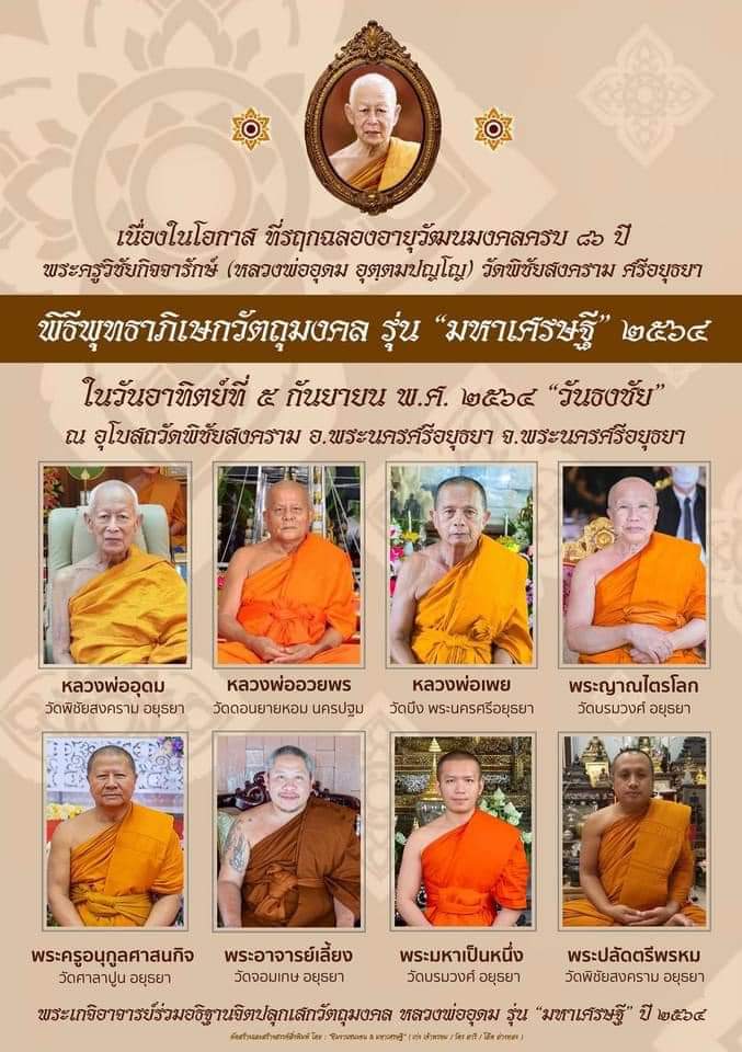 วันอาทิตย์ที่ 5 กันยายน 2564 ทางวัดพิชัยจัดพิธีพุทธภิเษก สมโภชน์ รูปเหมือนหลวงพ่ออุดมโดยตรงกับวัน “ธงชัย” ซึ่งหมายความว่า เวลาประกอบด้วยโชค คือ ความเป็นใหญ่ ความเข้าไปตั้งอยู่ในที่ศัตรูเข้าไปตั้งอยู่มิได้และเป็น สมโณฤกษ์ แปลว่า (สงบเรียบร้อย นักบวช นักสอนศาสนา มีพระเกตุเป็นผู้รักษาฤกษ์ใช้ได้เฉพาะกิจเกี่ยวกับความสงบร่มเย็นอันเป็นฤกษ์มงคลที่เหมาะสำหรับ ทำพิธีกรรมทางศาสนา และ การกระทำทุกอย่างเพื่อความสงบร่มเย็นเป็นสุข#พระอริยสงฆ์แห่งลุ่มแม่น้ำป่าสักศรีอยุธยา#หลวงพ่ออุดมวัดพิชัยสงคราม#มหาเศรษฐี