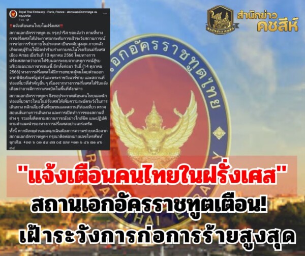 สถานเอกอัครราชทูต ณ กรุงปารีส ขอแจ้งว่า ตามที่ทางการ “ฝรั่งเศส” ได้ประกาศยกระดับการเฝ้าระวังสถานการณ์การก่อการร้ายภายในประเทศ เป็นระดับสูงสุด ภายหลังเกิดเหตุผู้ร้ายใช้มีดทำร้ายร่างกายคนในโรงเรียนฝรั่งเศส เมือง Arras เมื่อวันที่ 13 ต.ค. 2566
