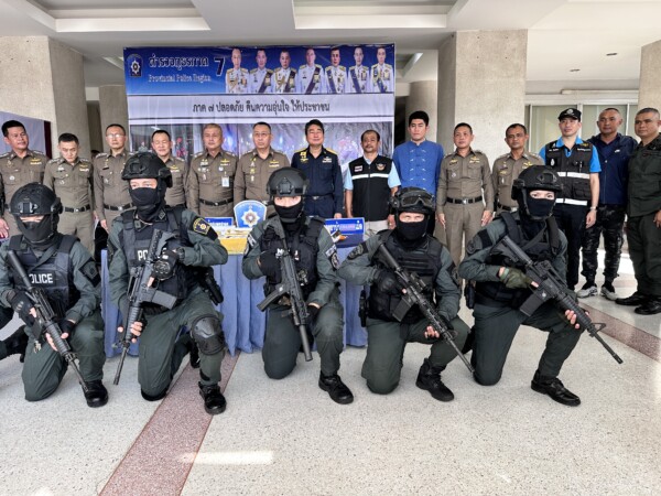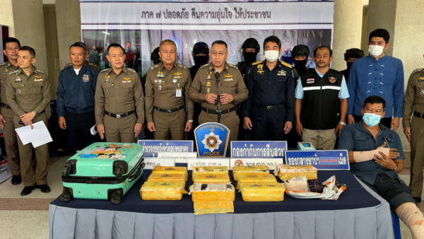 วันที่ 27 ตุลาคม 2566 ที่ตำรวจภูธรภาค7 จ.นครปฐม พล.ต.ท.นัยวัฒน์ ผะเดิมชิต ผบช.สยศ.ตร.รรท.ผบช.ภ.7, พล.ต.ต.อุทัย กวินเดชาธร รอง ผบช.ภ.7, พล.ต.ต.ชมชวิณ ปุระธนานนท์ รอง ผบช.ภ.7, พล.ต.ต.ดร.จักษ์ จิตตธรรม ผบก.ภ.จว.สมุทรสาคร , นายบรรพต จันทรวงษ์ นายอำเภอกระทุ่มแบน, และนายทัศน์พงษ์ วัฒนายากร ผอ.ปปส.ภาค 7 พร้อมชุดป้องกันและปราบปรามยาเสพติด ร่วมแถลงผลการจับกุมยาเสพติดรายใหญ่ สืบเนื่องจาก เมื่อวันที่ 19 – 20 ต.ค.66 เจ้าหน้าที่ตำรวจ กก.สส.ภ.จว.สมุทรสาคร ร่วมกับ เจ้าหน้าที่ ปปส.ภาค 7 และเจ้าหน้าที่ทหารหน่วยข่าวกรองทางทหาร ทภ.1 ได้ร่วมกันสืบสวนขยายผลจับกุมผู้ต้องหาคดียาเสพติด จำนวน 9 ราย ของกลาง ยาบ้า รวมการจับกุมทั้ง 2 ครั้งจำนวน 291,984 เม็ด ปืน 14 กระบอก โดยมีเจ้าหน้าที่ตำรวจที่ได้นรับบาดเจ็บจากการจู่โจมเข้าจับกุมดังกล่าว