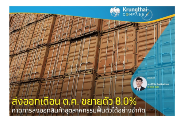 ชนม์นิธิศ ไชยสิงห์ทอง Krungthai COMPASS ระบุว่า มูลค่าส่งออกเดือน ต.ค.อยู่ที่ 23,578.8 ล้านดอลลาร์ฯ ขยายตัว 8.0%YoY เร่งตัวจากเดือนก่อนที่ 2.1%YoY แต่ต่ำกว่าการคาดการณ์ของตลาดที่ 9.3% การส่งออกขยายตัวเร่งขึ้นส่วนหนึ่งจากผลของฐานต่ำในปีก่อน ส่งผลให้การส่งออกสินค้าอุตสาหกรรมกลับมาขยายตัว และสินค้าเกษตรและอุตสาหกรรมเกษตรขยายตัวได้ต่อเนื่อง สำหรับการส่งออกทองคำเดือนนี้ขยายตัว 59.8% ทำให้เมื่อหักทองคำแล้ว มูลค่าส่งออกเดือนนี้ขยายตัว 6.8%YoY ทั้งนี้การส่งออก 10 เดือนแรกหดตัว -2.7%