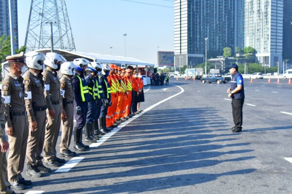 ด้านนายสุรเชษฐ์ เหล่าพูนสุข ผู้ว่าการ กทพ. กล่าวว่า การฝึกซ้อมการกู้ภัย และให้ความช่วยเหลืออุบัติเหตุร้ายแรงในทางพิเศษ จัดขึ้นปีละ 1 ครั้ง เพื่อเป็นการเตรียมความพร้อม ในการกู้ภัย และการให้ความช่วยเหลืออุบัติเหตุร้ายแรงในทางพิเศษ ให้เป็นไปด้วยความรวดเร็ว และถูกวิธี ซึ่งหากจะดำเนินการให้เกิดประสิทธิภาพ และเกิดความปลอดภัยสูงสุดสำหรับประชาชน จำเป็นที่จะต้องอาศัย การบูรณาการจากหน่วยงานต่าง ๆ ที่เกี่ยวข้อง โดยการฝึกซ้อมฯ ในวันนี้ จะจำลองสถานการณ์ให้รถตู้โดยสารเฉี่ยวชนกับ รถนั่งบุคคลระบบไฟฟ้า (EV) บริเวณด่านเก็บค่าผ่านทางพิเศษบางแก้ว 1 มีกลุ่มควันขึ้นที่รถ มีผู้ได้รับบาดเจ็บจำนวน 4 ราย และบาดเจ็บสาหัส 2 ราย โดยจะต้องลำเลียงผู้บาดเจ็บที่มีอาการสาหัสทางอากาศยาน โดย กทพ. ได้รับความร่วมมือจาก สถาบันการแพทย์ฉุกเฉินแห่งชาติ (สพฉ.) บริษัททางด่วนและรถไฟฟ้ากรุงเทพ จำกัด (มหาชน) เทศบาลบางแก้ว และสถานีตำรวจภูธรบางแก้ว