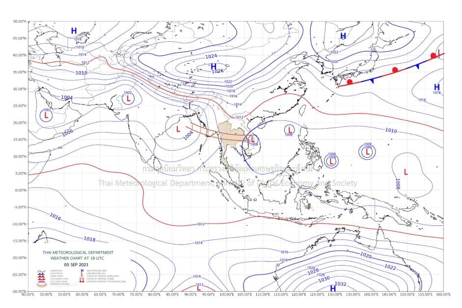 #กรมอุตุนิยมวิทยา#ประจำวันที่ 6 กันยายน 2564ลักษณะอากาศทั่วไป พยากรณ์อากาศ 24 ชั่วโมงข้างหน้า ร่องมรสุมพาดผ่านภาคเหนือ ภาคตะวันออกเฉียงเหนือ เข้าสู่หย่อมความกดอากาศต่ำบริเวณประเทศลาว และเวียดนามตอนกลาง ประกอบกับมรสุมตะวันตกเฉียงใต้กำลังปานกลางพัดปกคลุมทะเลอันดามัน ประเทศไทย และอ่าวไทย ลักษณะเช่นนี้ทำให้บริเวณประเทศไทย มีฝนฟ้าคะนองเกิดขึ้น โดยมีฝนตกหนักบางแห่งในภาคเหนือ ภาคตะวันออกเฉียงเหนือ และภาคตะวันออก ขอให้ประชาชนที่อาศัยอยู่ในพื้นที่เสี่ยงภัยในบริเวณดังกล่าว ระวังอันตรายจากฝนตกหนักและฝนที่ตกสะสมซึ่งอาจทำให้เกิดน้ำท่วมฉับพลันและน้ำป่าไหลหลากในระยะนี้ฝุ่นละอองขนาดเล็ก ในช่วงของฤดูฝนการสะสมของฝุ่นละออง/หมอกควันมีน้อยพยากรณ์อากาศสำหรับประเทศไทยตั้งแต่เวลา 06:00 วันนี้ ถึง 06:00 วันพรุ่งนี้.ภาคเหนือ มีฝนฟ้าคะนองร้อยละ 70 ของพื้นที่ และมีฝนตกหนักบางแห่งบริเวณจังหวัดแม่ฮ่องสอน เชียงใหม่ เชียงราย ลำพูน ลำปาง ตาก สุโขทัยกำแพงเพชร พิษณุโลก และเพชรบูรณ์อุณหภูมิต่ำสุด 23-25 องศาเซลเซียสอุณหภูมิสูงสุด 31-33 องศาเซลเซียสลมตะวันออกเฉียงใต้ ความเร็ว 10-20 กม./ชม.ภาคตะวันออกเฉียงเหนือ มีฝนฟ้าคะนองร้อยละ 70 ของพื้นที่ และมีฝนตกหนักบางแห่งบริเวณจังหวัดหนองคาย บึงกาฬ อุดรธานี สกลนคร นครพนม มุกดาหาร อำนาจเจริญ ยโสธรขอนแก่น กาฬสินธุ์ ชัยภูมิ นครราชสีมา บุรีรัมย์ มหาสารคาม สุรินทร์ และอุบลราชธานีอุณหภูมิต่ำสุด 24-25 องศาเซลเซียสอุณหภูมิสูงสุด 30-33 องศาเซลเซียสลมตะวันตกเฉียงใต้ ความเร็ว 10-20 กม./ชม.ภาคกลาง มีฝนฟ้าคะนองร้อยละ 60 ของพื้นที่ส่วนมากบริเวณจังหวัดนครสวรรค์ ลพบุรี อุทัยธานี ชัยนาท สุพรรณบุรีกาญจนบุรี ราชบุรี นครปฐม และสมุทรสงครามอุณหภูมิต่ำสุด 23-25 องศาเซลเซียสอุณหภูมิสูงสุด 32-34 องศาเซลเซียสลมตะวันตกเฉียงใต้ ความเร็ว 10-20 กม./ชม.ภาคตะวันออก มีฝนฟ้าคะนองร้อยละ 60 ของพื้นที่ และมีฝนตกหนักบางแห่งบริเวณจังหวัดนครนายก ปราจีนบุรี ระยอง จันทบุรี และตราดอุณหภูมิต่ำสุด 23-26 องศาเซลเซียสอุณหภูมิสูงสุด 30-33 องศาเซลเซียสลมตะวันตกเฉียงใต้ ความเร็ว 15-30 กม./ชม.ทะเลมีคลื่นสูงประมาณ 1 เมตร บริเวณที่มีฝนฟ้าคะนองคลื่นสูง 1-2 เมตรภาคใต้ (ฝั่งตะวันออก) มีฝนฟ้าคะนองร้อยละ 30 ของพื้นที่ส่วนมากบริเวณจังหวัดเพชรบุรี ประจวบคีรีขันธ์ ชุมพร และสุราษฏร์ธานีอุณหภูมิต่ำสุด 24-25 องศาเซลเซียสอุณหภูมิสูงสุด 32-35 องศาเซลเซียสลมตะวันตกเฉียงใต้ ความเร็ว 15-30 กม./ชม.ทะเลมีคลื่นสูงประมาณ 1 เมตร บริเวณที่มีฝนฟ้าคะนองคลื่นสูง 1-2 เมตรภาคใต้ (ฝั่งตะวันตก) มีฝนฟ้าคะนองร้อยละ