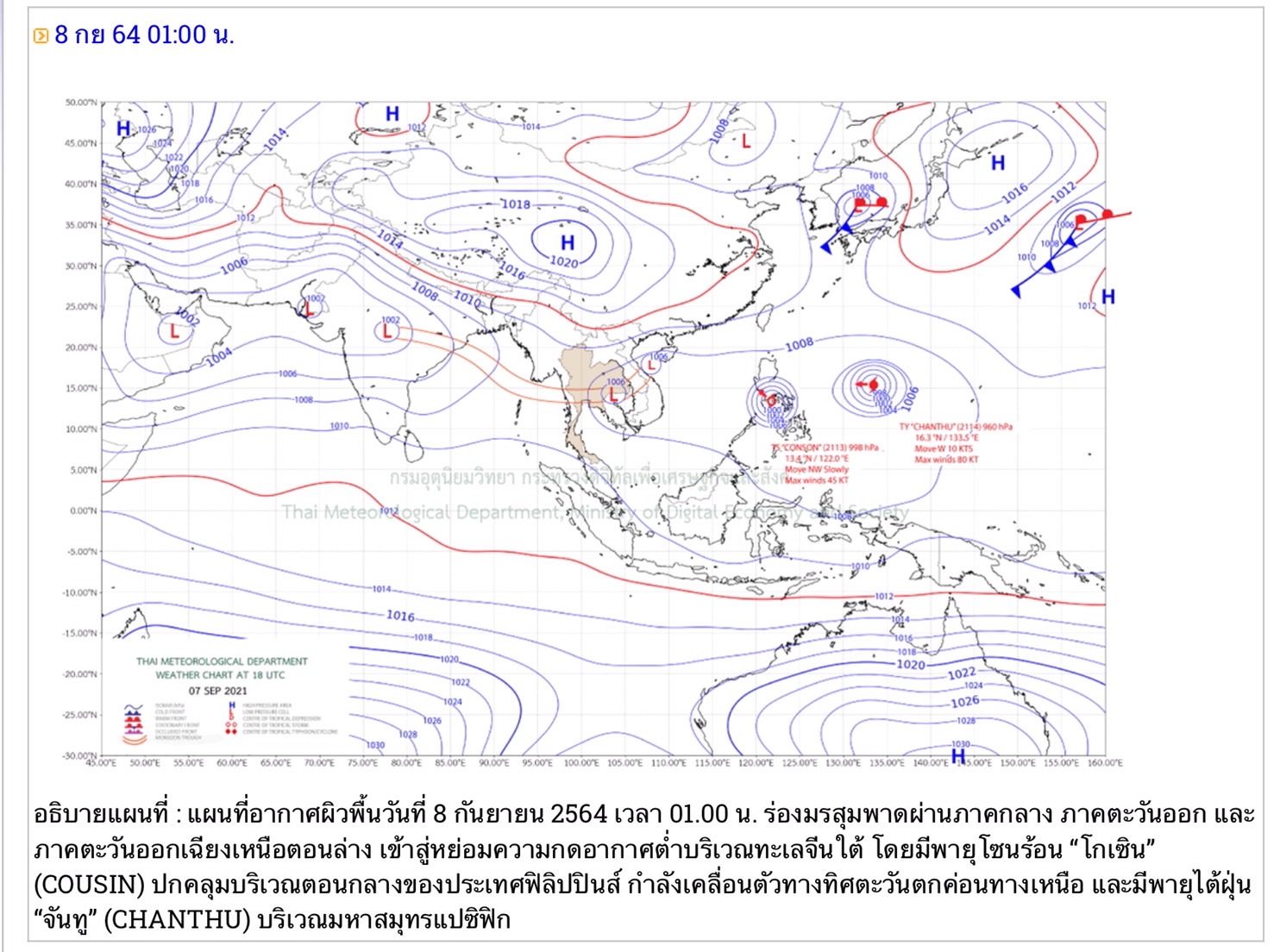 #กรมอุตุนิยมวิทยา#ประจำวันที่ 8 กันยายน 2564ลักษณะอากาศทั่วไป พยากรณ์อากาศ 24 ชั่วโมงข้างหน้า ประเทศไทยมีฝนตกต่อเนื่องและมีฝนตกหนักหลายพื้นที่ โดยมีฝนตกหนักมากบางแห่งในภาคตะวันออกเฉียงเหนือตอนล่าง ภาคกลาง และภาคตะวันออก เนื่องจากร่องมรสุมพาดผ่านภาคกลาง ภาคตะวันออก และภาคตะวันออกเฉียงเหนือตอนล่าง เข้าสู่หย่อมความกดอากาศต่ำบริเวณทะเลจีนใต้ ประกอบกับมรสุมตะวันตกเฉียงใต้ที่พัดปกคลุมทะเลอันดามัน ประเทศไทย และอ่าวไทย เริ่มมีกำลังแรงขึ้น ขอให้ประชาชนที่อาศัยอยู่ในพื้นที่เสี่ยงภัยภาคแหนือ ภาคตะวันออกเฉียงเหนือตอนล่าง ภาคกลาง ภาคตะวันออก และภาคใต้ ระวังอันตรายจากฝนตกหนักและฝนตกสะสมซึ่งอาจทำให้เกิดน้ำท่วมฉับพลันและน้ำป่าไหลหลากไว้ด้วยอนึ่ง พายุโซนร้อน “โกนเซิน” (CONSON) ที่ปกคลุมตอนกลางของประเทศฟิลิปปินส์ กำลังเคลื่อนตัวไปทางทิศตะวันตกค่อนทางเหนือเล็กน้อย คาดว่าจะเคลื่อนตัวลงสู่ทะเลจีนใต้ในวันที่ 9 กันยายน 2564 และเคลื่อนผ่านเกาะไหหลำลงสู่อ่าวตังเกี๋ยในช่วงวันที่ 12-13 กันยายน 2564ฝุ่นละอองขนาดเล็ก ในช่วงของฤดูฝนการสะสมของฝุ่นละออง/หมอกควันมีน้อย พยากรณ์อากาศสำหรับประเทศไทยตั้งแต่เวลา 06:00 วันนี้ ถึง 06:00 วันพรุ่งนี้.ภาคเหนือ มีฝนฟ้าคะนองร้อยละ 70 ของพื้นที่ และมีฝนตกหนักบางแห่งส่วนมากบริเวณจังหวัดน่าน แพร่ อุตรดิตถ์ พิษณุโลก พิจิตร เพชรบูรณ์ กำแพงเพชร และตากอุณหภูมิต่ำสุด 23-25 องศาเซลเซียสอุณหภูมิสูงสุด 32-35 องศาเซลเซียสลมตะวันตกเฉียงใต้ ความเร็ว 10-20 กม./ชม.ภาคตะวันออกเฉียงเหนือ มีฝนฟ้าคะนองร้อยละ 80 ของพื้นที่ และมีฝนตกหนักถึงหนักมากบางแห่งบริเวณจังหวัดเลย หนองบัวลำภู อุดรธานี หนองคาย บึงกาฬ นครพนม สกลนคร กาฬสินธุ์ มหาสารคาม ขอนแก่น ชัยภูมิ นครราชสีมา บุรีรัมย์ สุรินทร์ ศรีสะเกษ อุบลราชธานี และอำนาจเจริญอุณหภูมิต่ำสุด 23-25 องศาเซลเซียสอุณหภูมิสูงสุด 32-34 องศาเซลเซียสลมตะวันตกเฉียงใต้ ความเร็ว 10-20 กม./ชม.ภาคกลาง มีฝนฟ้าคะนองร้อยละ 80 ของพื้นที่ และมีฝนตกหนักหนักมากบางแห่ง บริเวณจังหวัดนครสวรรค์ ลพบุรี สระบุรี สิงห์บุรี อ่างทอง พระนครศรีอยุธยา นครปฐม กาญจนบุรี ราชบุรี สมุทรสงคราม และสมุทรสาครอุณหภูมิต่ำสุด 24-26 องศาเซลเซียสอุณหภูมิสูงสุด 30-33 องศาเซลเซียสลมตะวันตกเฉียงใต้ ความเร็ว 10-20 กม./ชม.ภาคตะวันออก มีฝนฟ้าคะนองร้อยละ 80 ของพื้นที่ และมีฝนตกหนักถึงหนักมากบางแห่ง บริเวณจังหวัดนครนายก ปราจีนบุรี สระแก้ว ฉะเชิงเทรา ชลบุรี ระยอง จันทบุรี และตราดอุณหภูมิต่ำสุด 23-26 องศาเซลเซียสอุณหภูมิสูงสุด 29-32 องศาเซลเซียสลมตะวันตกเ