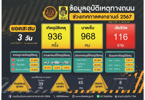 วันที่ 14 เม.ย. 67 ที่กรมป้องกันและบรรเทาสาธารณภัย ศูนย์อำนวยการป้องกันและลดอุบัติเหตุทางถนนช่วงเทศกาลสงกรานต์ พ.ศ. 2567 สรุปสถิติอุบัติเหตุทางถนนประจำวันที่ 13 เมษายน 2567 เกิดอุบัติเหตุ 392 ครั้ง ผู้บาดเจ็บ 411 คน ผู้เสียชีวิต 48 ราย สรุปอุบัติเหตุทางถนนสะสมในช่วง 3 วันของการรณรงค์ (11 – 13 เม.ย. 67) เกิดอุบัติเหตุรวม 936 ครั้ง ผู้บาดเจ็บ รวม 968 คน ผู้เสียชีวิต รวม 116 ราย จังหวัดที่ไม่มีผู้เสียชีวิต (ตายเป็นศูนย์) มี 28 จังหวัด ศปถ. ได้เน้นย้ำจังหวัด คุมเข้มดูแลความปลอดภัยในการเดินทางบนถนนระหว่างจังหวัด อำเภอ หมู่บ้าน ชุมชนมากขึ้น กำชับเจ้าหน้าที่ประจำจุดตรวจกวดขันพฤติกรรมเสี่ยงอุบัติเหตุ ทั้งดื่มแล้วขับ ขับรถเร็ว การใช้อุปกรณ์นิรภัย การขับขี่ในลักษณะที่อาจก่อให้เกิดอันตราย และการบรรทุกผู้โดยสารท้ายรถกระบะเล่นน้ำสงกรานต์ ควบคุมการจำหน่ายเครื่องดื่มแอลกอฮอล์ในเวลาที่กฎหมายกำหนดเท่านั้นรวมถึงประเมินความพร้อมสภาพร่างกายของผู้ขับขี่ เพื่อป้องกันอุบัติเหตุจากการหลับในและดื่มแล้วขับ